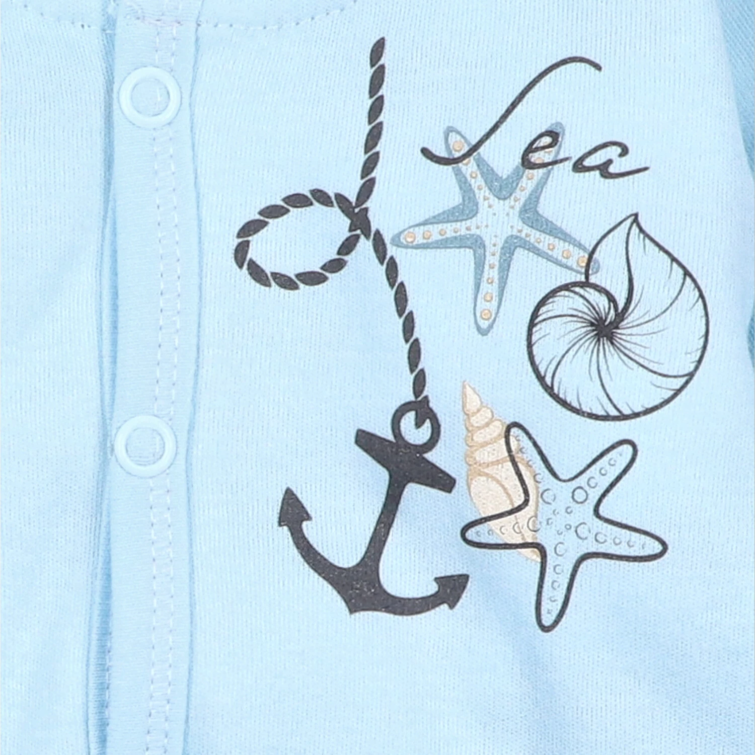 Model dwuwarstwowy, z ozdobną podszewką w muszelki. Przód bluzy zdobi subtelny nadruk. Zapinana na całej długości na bezniklowe napy, co znacznie ułatwia ubieranie i rozbieranie dziecka.