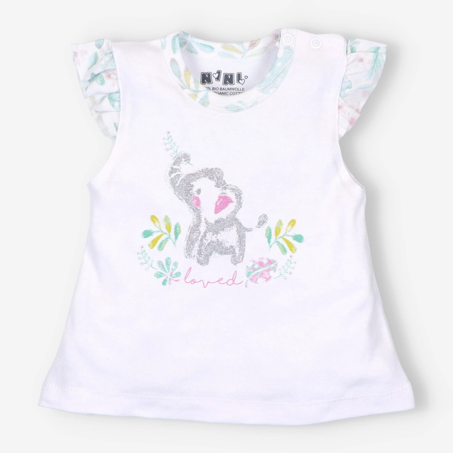 Biały t-shirt niemowlęcy dla dziewczynki z kolekcji BLOOMING SUMMER z delikatnym nadrukiem na przodzie. Uszyty w Polsce z niezwykle przyjemnej i delikatnej bawełny organicznej. Bawełna jest bezpieczna dla skóry alergicznej i skłonnej do podrażnień i nie posiada chemicznego zapachu. Doskonała alternatywa dla tradycyjnego body. Klasyczny, luźny fason idealny do różnych stylizacji. Ubranko niemowlęce przydatne zarówno latem jak i zimą.
