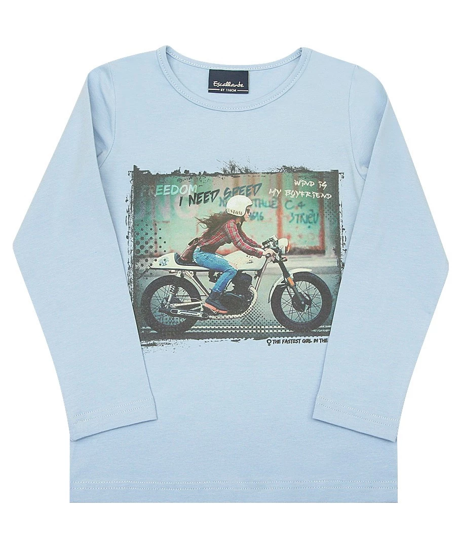 Bluzka dziewczęca z długim rękawem w kolorze niebieskim. Wykonana z wysokiej jakości dzianiny, bardzo przyjemnej w dotyku. Ciekawa propozycja dla aktywnych dziewczynek