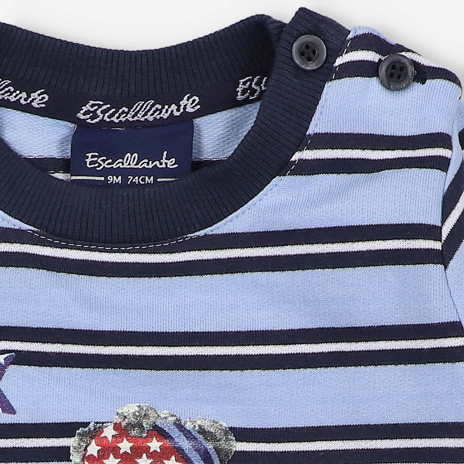 Bluza dresowa dla chłopca, niebieska w grafitowe paski. Wykonana z wysokogatunkowej dzianiny dresowej. Ciekawy nadruk i klasyczny krój ubranka sprawia, że jest ona idealna na każdą porę roku.