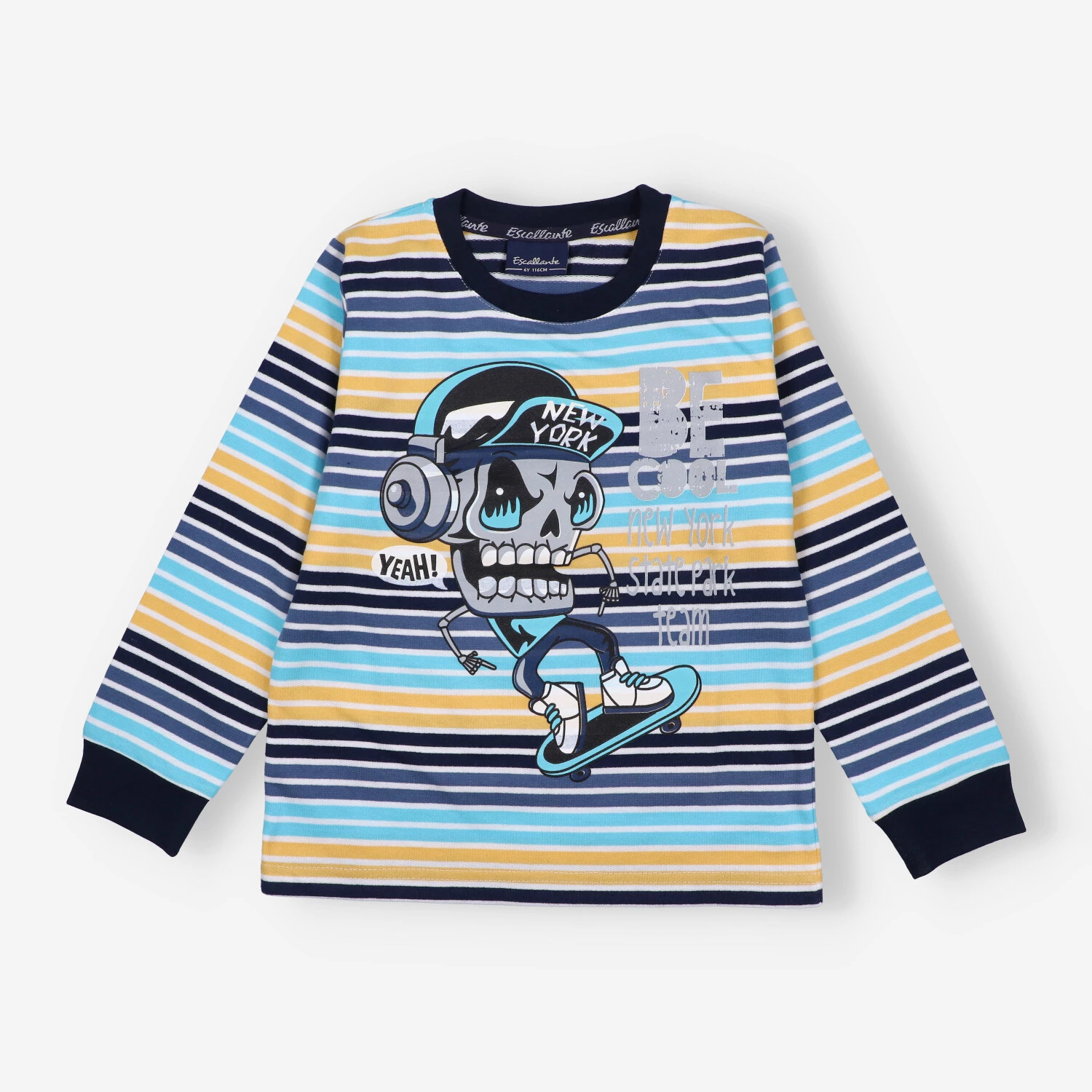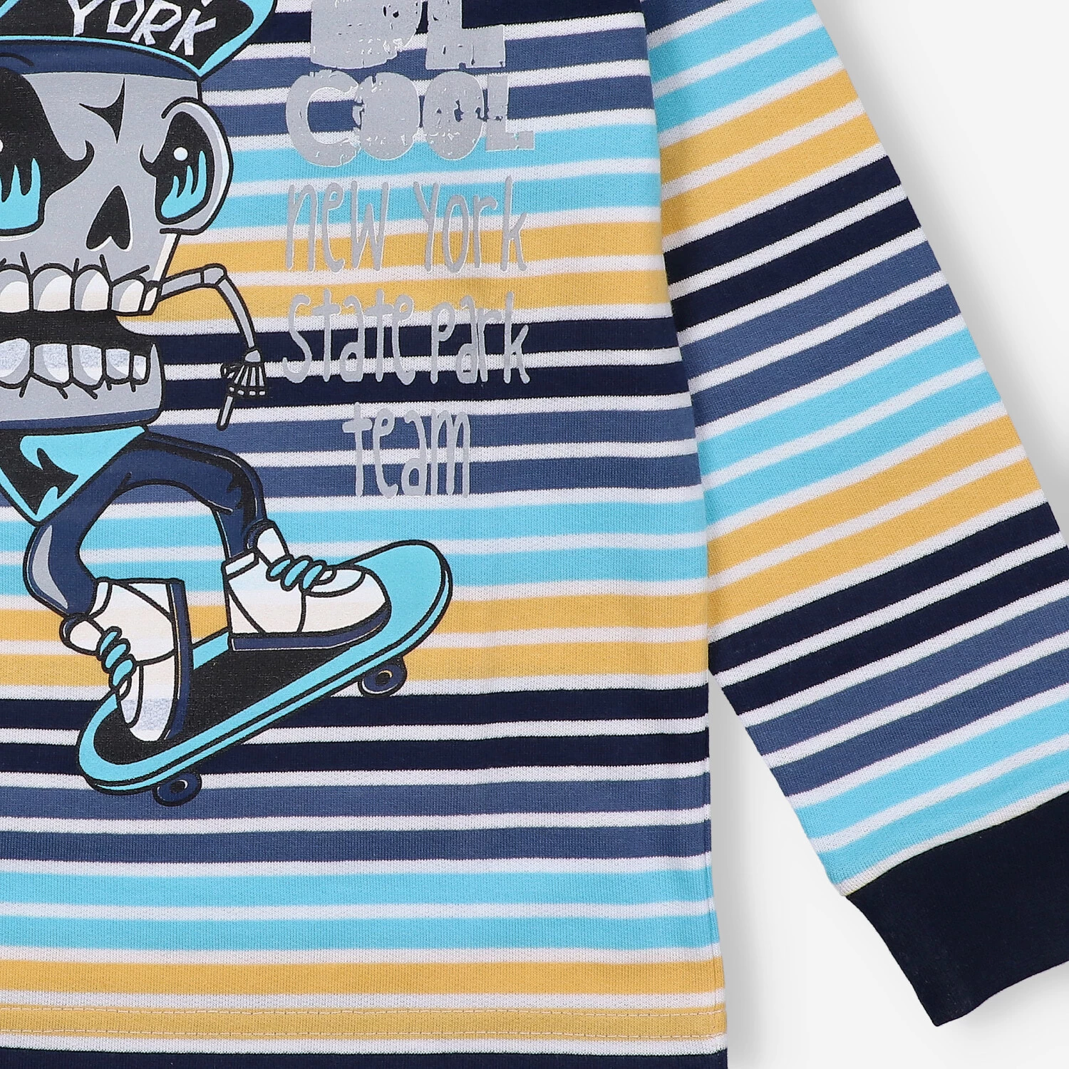 Bluza chłopięca w paski. Wykonana z wysokogatunkowej bawełny. Rękawy i podkrój szyi wykończone elastycznym ściągaczem. Przód zdobi interesujący, miękki nadruk.