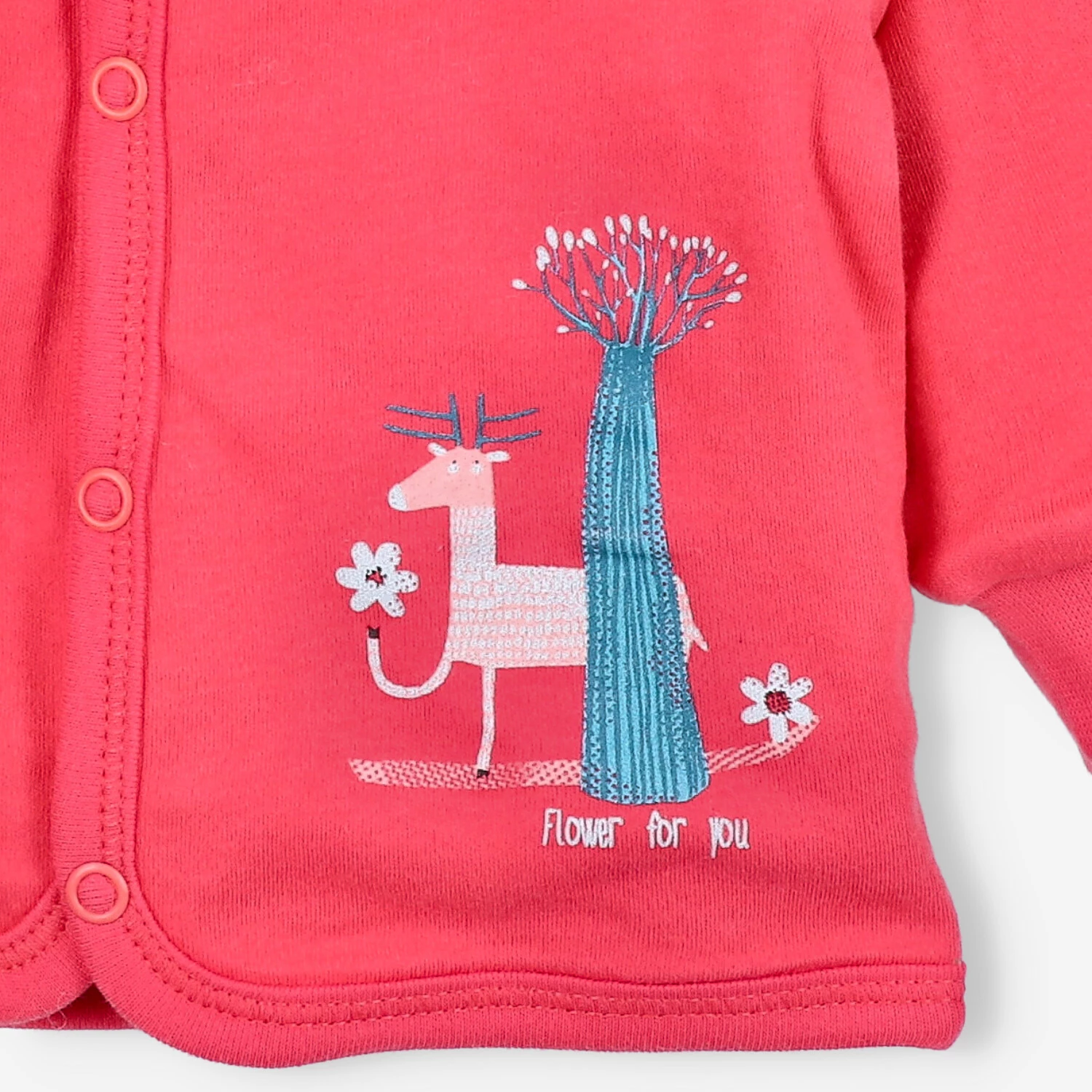 Naturalne włókna są mocniejsze, bardziej elastyczne i odporne na rozciąganie, dzięki czemu ubranko na długo zachowuje swoją jakość. Bluza posiada bezpieczne bezniklowe napy oraz miękkie lamówki, które nie podrażniają wrażliwej skóry dziecka. Została zaprojektowana jako dwustronna – jedna strona w ciepłym odcieniu koralu, druga ozdobiona kolorowym nadrukiem.