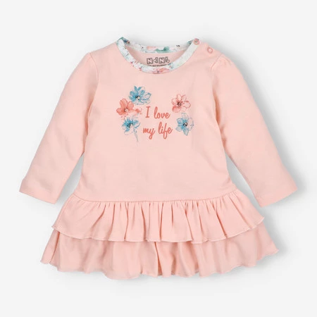 Łososiowa sukienka z kolekcji FLOWERS z falbankami. Uszyta w Polsce z bardzo przyjemnej w dotyku bawełny organicznej. Do produkcji tego materiału stosuje się jedynie naturalne metody. Włókna bawełny eko są silniejsze, bardziej sprężyste i odporne na rozciąganie dzięki czemu posłużą dłużej. Bezniklowe napy i delikatne, miękkie lamówki to dodatkowe atuty ubranka. Sukieneczka uszyta z dzianiny dresowej. Marka NINI jako jedna z niewielu w Polsce posiada międzynarodowy certyfikat OEKO-TEX STANDARD 100, który potwierdza, że jej wyroby spełniają najwyższe normy bezpieczeństwa dla niemowląt Kupując ubranka NINI dbasz o środowisko oraz bezpieczeństwo i zdrowie swoich dzieci. Sklep Let's go wspiera polskich producentów.