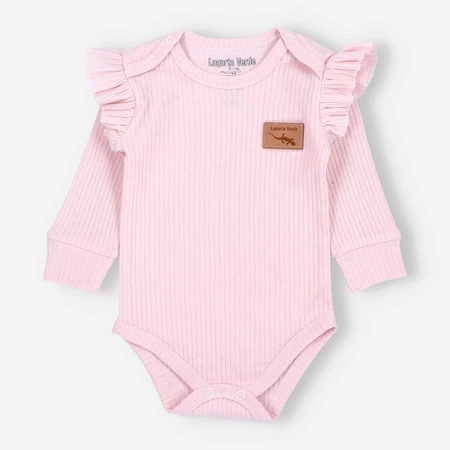 Body z dzianiny prążkowej z falbankami Uszyte w Polsce z wysokogatunkowej elastycznej dzianiny , przemiłej w dotyku bawełny premium. Bezniklowe napy i delikatne, miękkie lamówki to dodatkowe atuty ubranka. Ubranko nie zmienia fasonu, ani koloru nawet po wielokrotnym praniu.