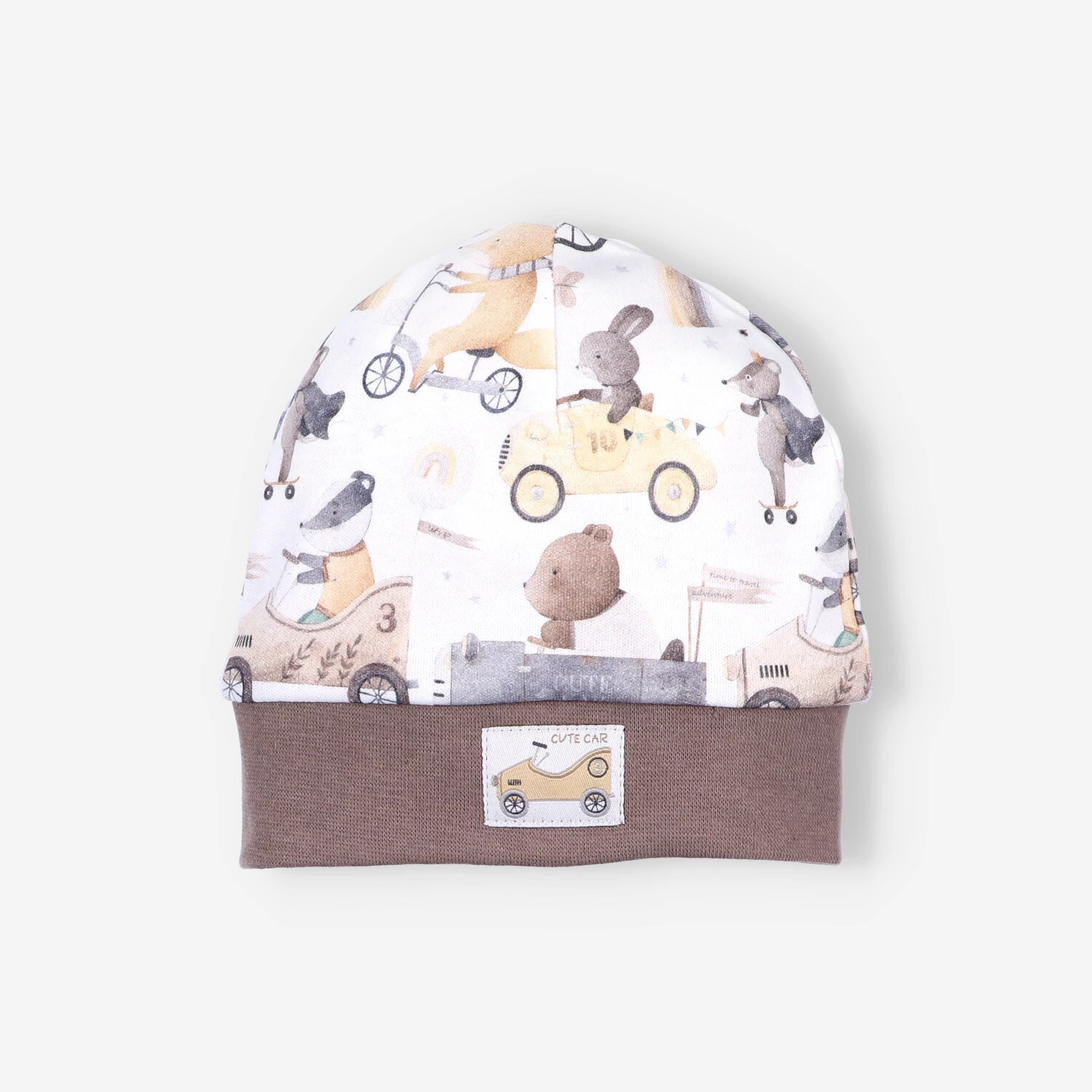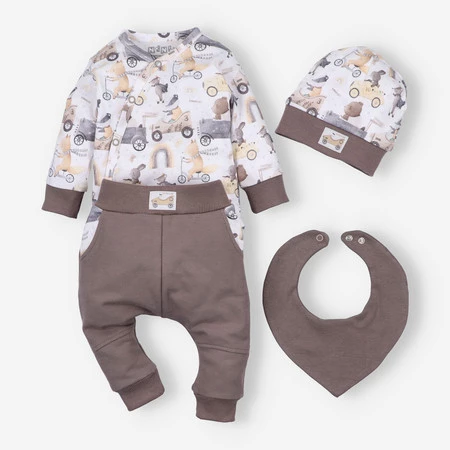 Komplet niemowlęcy dla chłopca z kolekcji Cute Cars – body, spodnie, czapeczka i apaszka