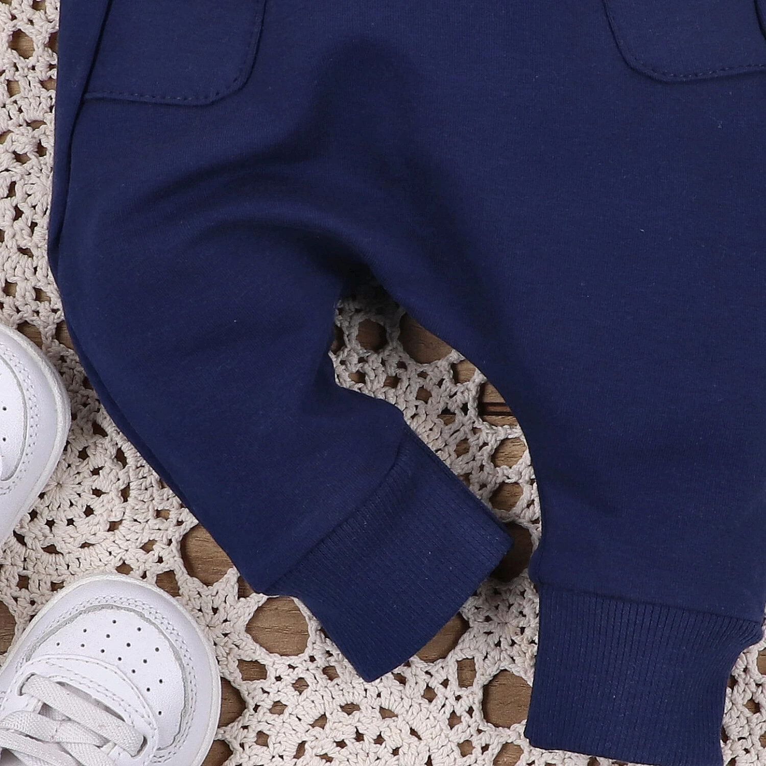Pas z elastyczną gumką i delikatnym ściągaczem zapewnia wygodne dopasowanie, a zakończenia nogawek utrzymują spodnie na miejscu, nie ograniczając ruchów dziecka. Urocze falbanki z boku i z tyłu dodają całości lekkości i dziewczęcego uroku. Idealne do noszenia w domu oraz podczas spacerów.