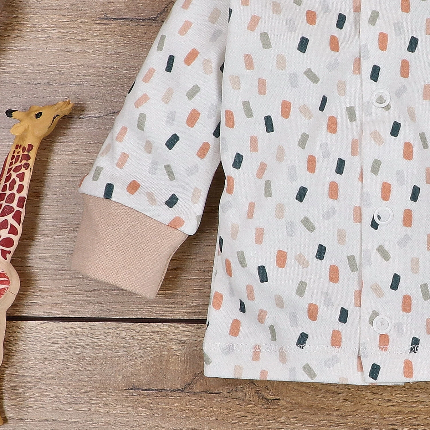 Kaftanik dla niemowląt został wykonany w Polsce z wyjątkowo miękkiej i przyjaznej dla skóry bawełny organicznej. Ubranko powstało z najwyższą precyzją i troską o detale. W procesie produkcji tkaniny wykorzystywane są wyłącznie naturalne metody, co sprawia, że włókna ekologicznej bawełny są trwalsze, bardziej elastyczne i odporne na rozciąganie – dzięki czemu ubranko będzie służyło przez długi czas. Bezniklowe zatrzaski oraz miękkie lamówki to dodatkowe elementy zwiększające komfort użytkowania.