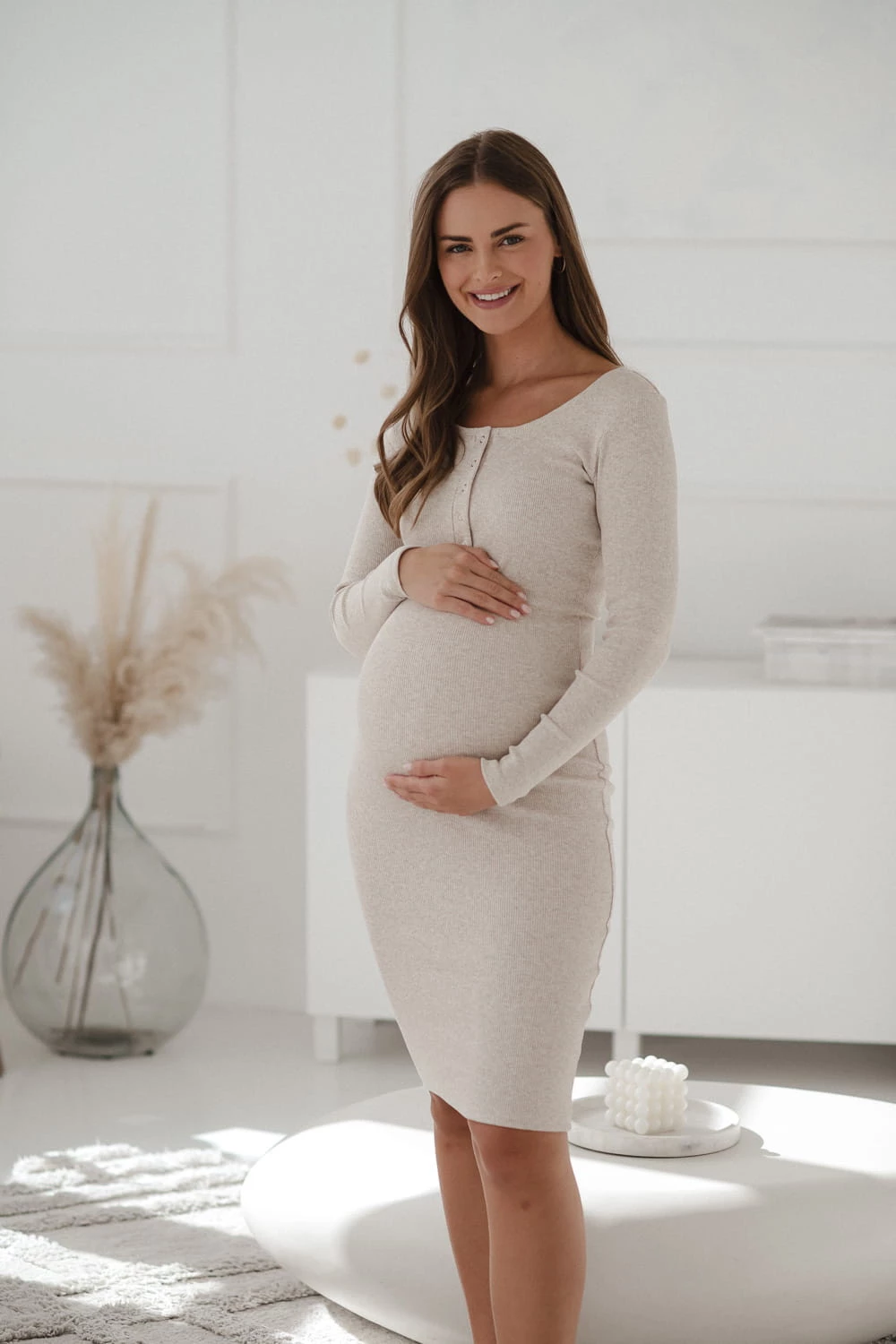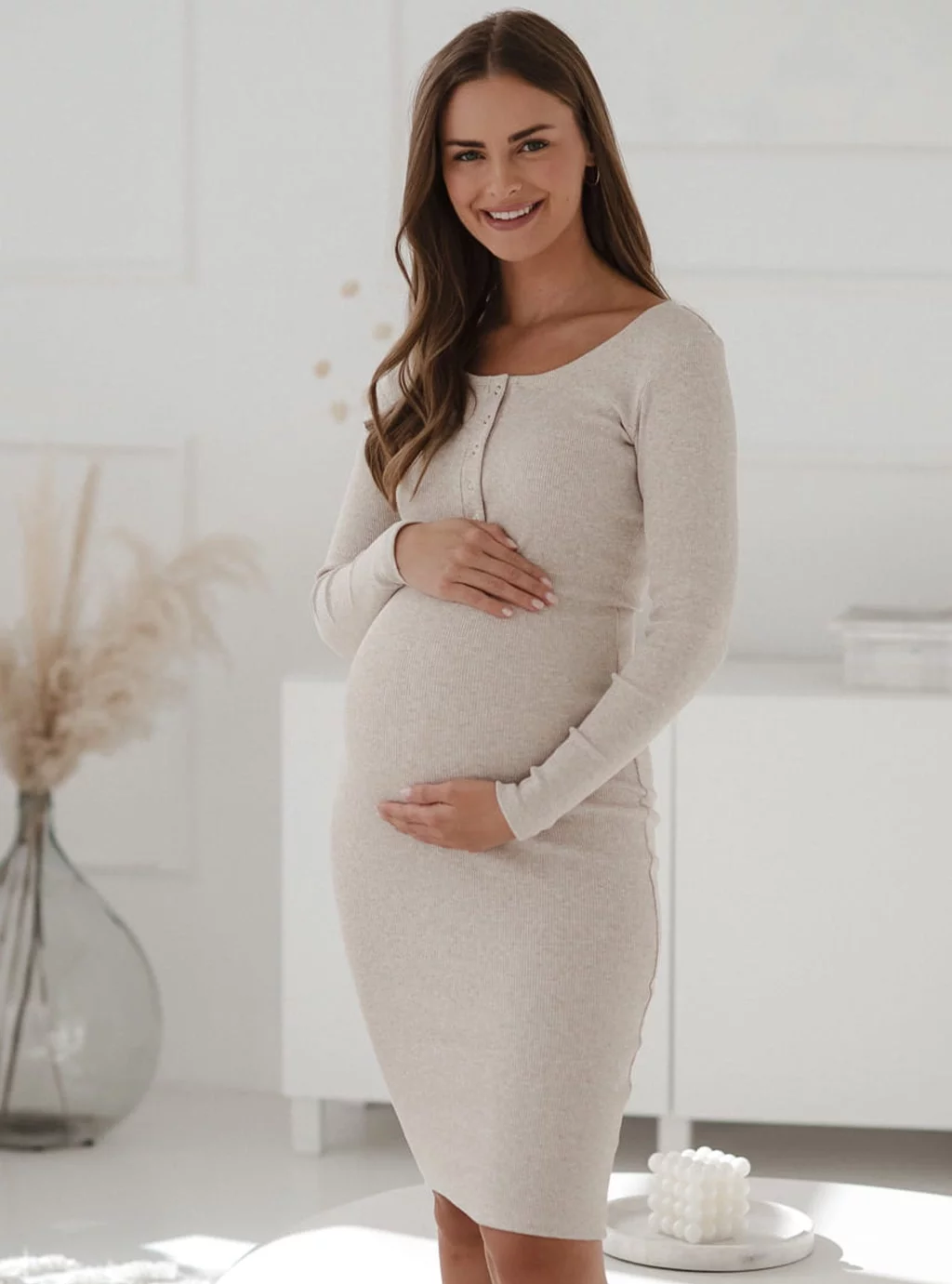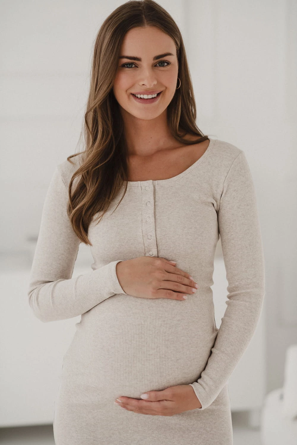 Dzięki praktycznym napom przy dekolcie, sukienka Tummy zapewnia wygodny dostęp do karmienia piersią w każdej sytuacji, a jednocześnie pełni funkcję ozdobną, podkreślając elegancko linię biustu. Prążkowana struktura tkaniny nie tylko dodaje jej modnego charakteru, ale także pozwala na dopasowanie sukienki do zmieniającej się sylwetki.