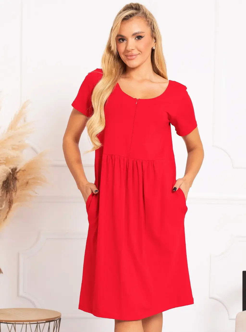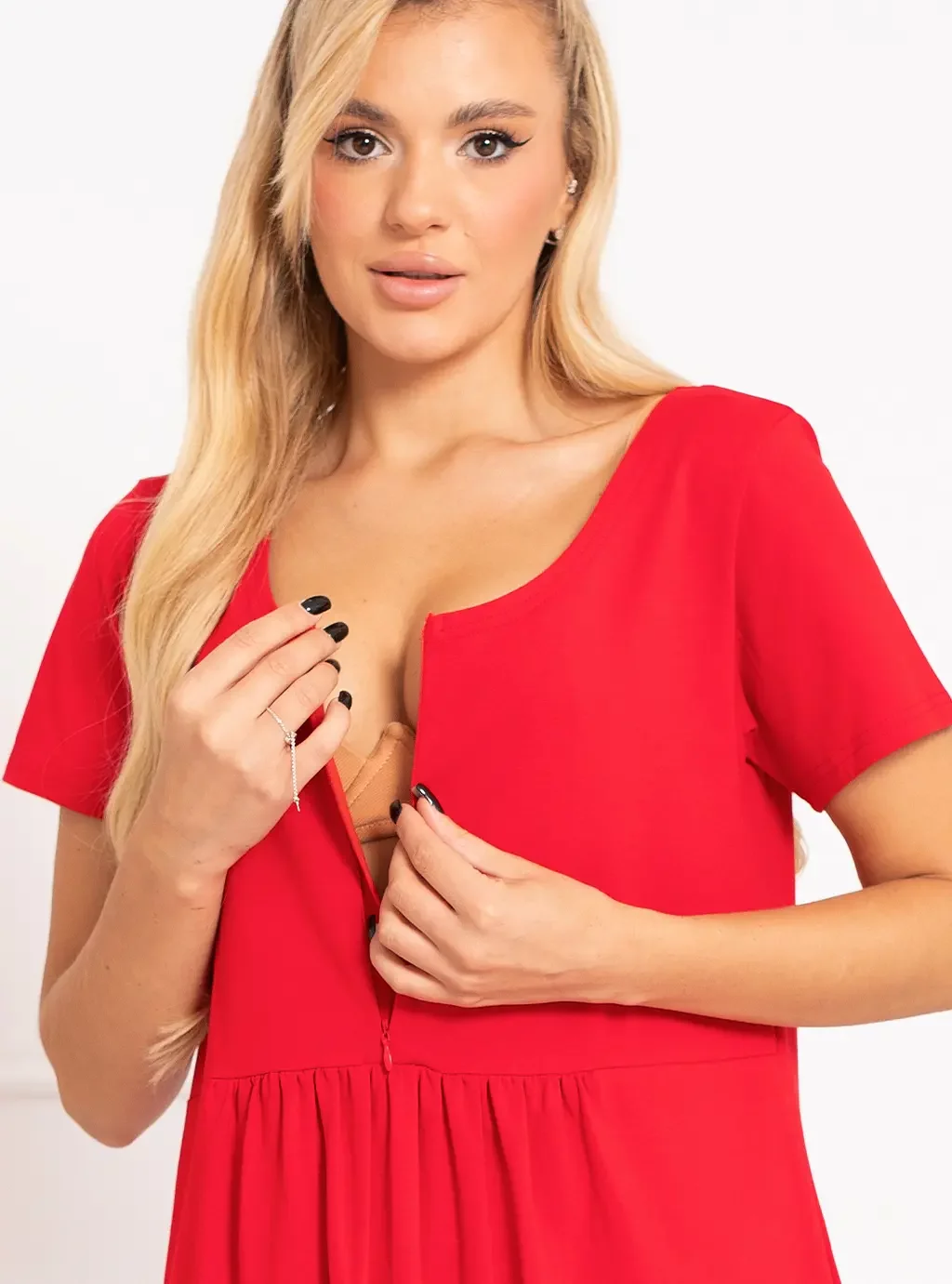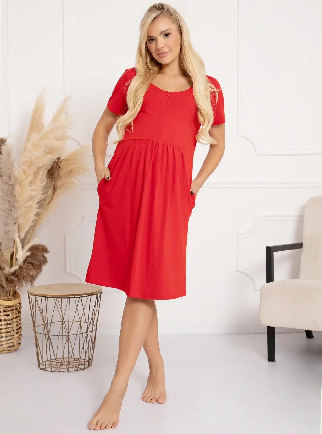 Ładna czerwień w wydaniu ciążowym to kobieca koszula nocna Laura która wyglądem przypomina letnie sukienki z zamkiem błyskawicznym na środku. Bawełniane koszule dla karmiących to wybór dla kobiet które cenią sobie odzież nocną przypominającą ubrania ciążowe. Laura w kolorze seksownej czerwieni to takie właśnie rozwiązanie.