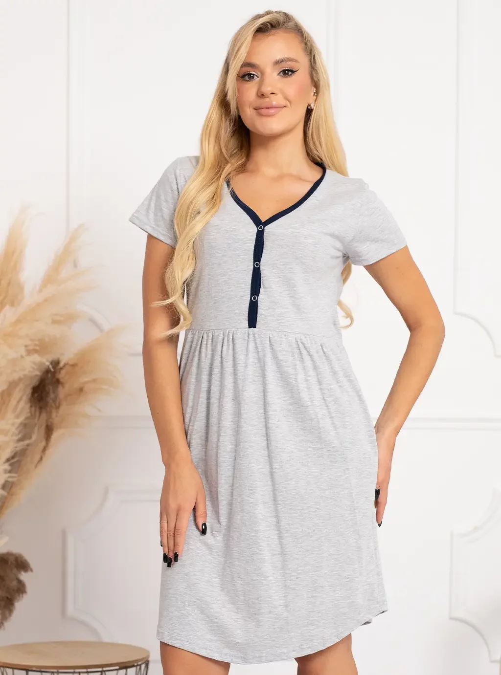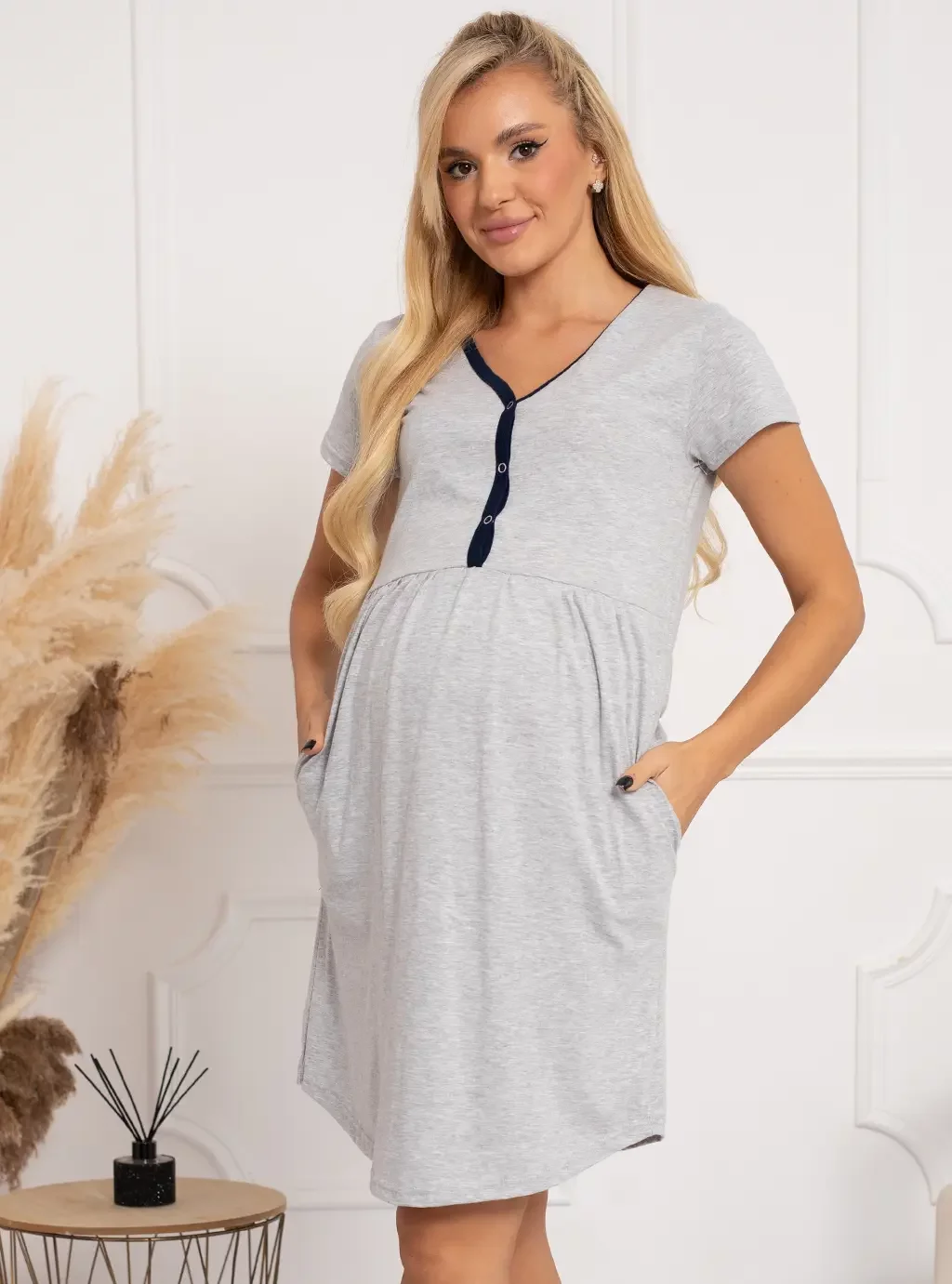 Bawełniane koszule nocne z kolekcji koszul Ismena od marki Formommy z krótkim klasycznym rękawem to strzał w 10 w czasie ciąży i w okresie karmienia piersią. Te idealne koszule nocne umożliwiają karmienie w prosty i nieskomplikowany sposób a przede wszystkim nie krępują ruchów przyszłej mamy kiedy ciążowy brzuszek tak szybko się zmienia. Dobrze dobrana koszula usprawni nocne karmienia noworodka i zada o komfort przyszłej mamy w czasie ciąży. Prezentowany model Koszula Ismena to ładnie uszyta szara koszula z granatową lamówką i marszczeniem pod piersiami żeby pomieścić ciążowy brzuszek. Bezniklowe napy bo tak są rozpinane koszule nocne w tej kolekcji nie uczulą mamy ani dziecka w trakcie karmienia.