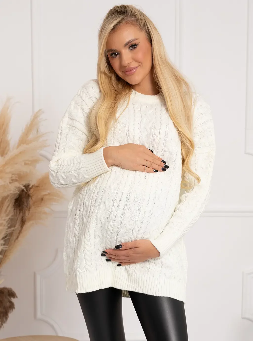 Już teraz zainwestuj w wygodne swetry na chłodniejsze dni lub zimowe wieczory. Idealny sweter z długim rękawem w atrakcyjny warkocz to strzał w 10! na czas ciąży ale również na okres przed i po. Miękki sweter w kolorze ecru to to fajny outfit który może Ci towarzyszyć na każdym etapie ciąży ponieważ klasyczne swetry to model który nigdy nie wychodzi z mody z powodzeniem może służyć jako luźniejszy sweter ciążowy dla przyszłych mam. Stylowe swetry damskie pasują do legginsów lub spódnic, zastąpią klasyczna odzież ciążową na każdym etapie ciąży.