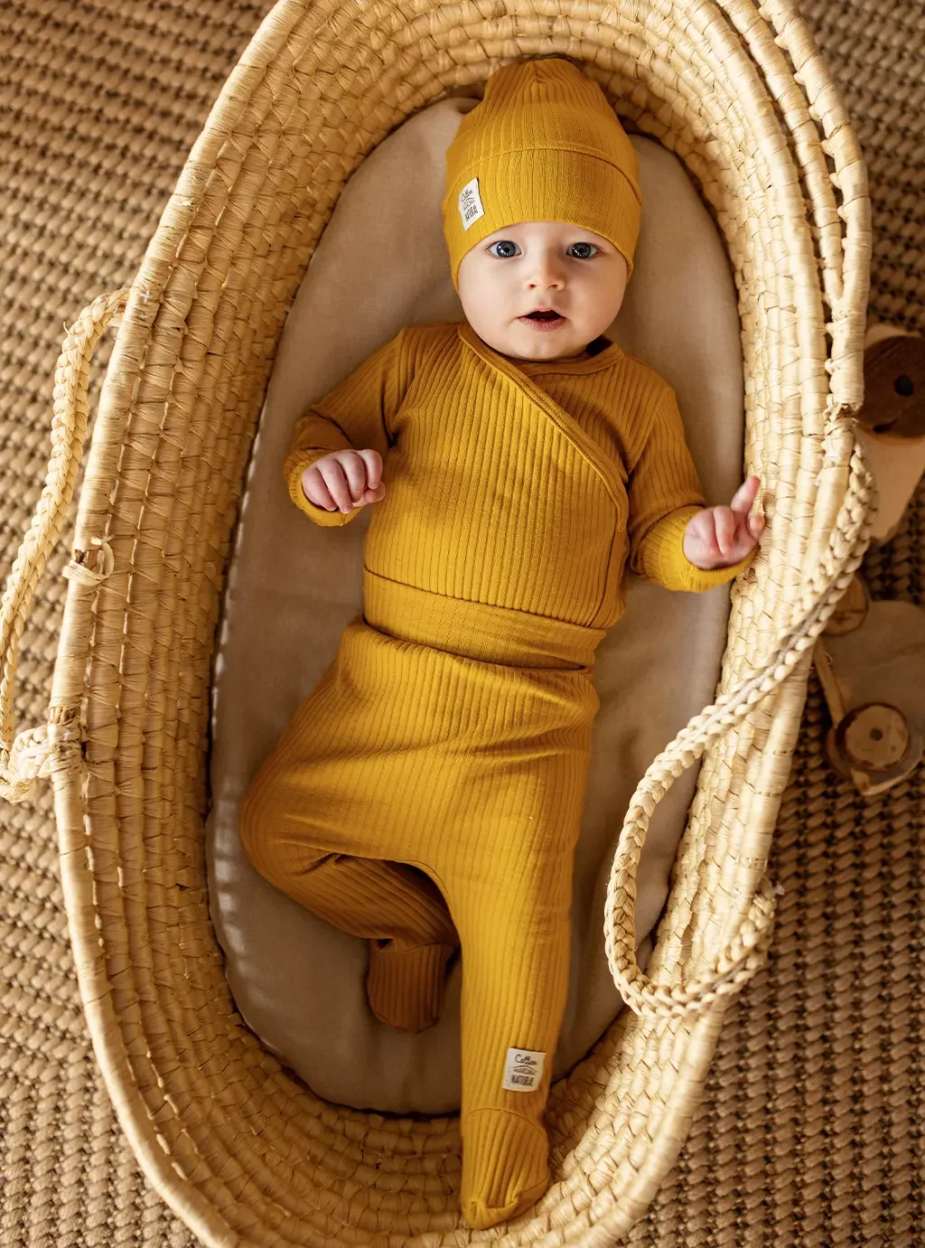 Śpioszki z delikatnym ściągaczem to niezastąpiony element wyprawki niemowlęcej. Polskie ubranka niemowlęce z delikatnej prążkowanej bawełny mają wszyte stópki które zapobiegają wysuwaniu małych nóżek. Natural Harmony to kolekcja w kolorowe prążki możesz mieszać je dowolnie lub zebrać tylko serię w kolorze Honey. Delikatny ściągacz nie uciska brzuszka dziecka dzięki czemu ma swobodę ruchów.