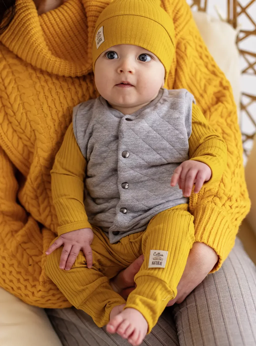 Komfortowe spodnie niemowlęce dla chłopca lub dziewczynki wykonane po to żeby zapewnić maluszkowi ciepło, wygodę oraz stylowy wygląd w czasie kiedy odkrywa świat. Zwróć uwagę na te prążkowane spodnie bawełniane dla niemowląt w kolorze honey - dobre na każdą pogodę i dziecięcy humorek. Klasyczny krój z nie uciskającym pasem pozwala na utrzymanie tych komfortowych legginsów dla niemowląt na właściwym miejscu Wybierając te idealne spodnie dla niemowlaka zadbasz o wrażliwą, delikatną skórę dziecka nawet skłonną do alergii. Wybierz wysokiej jakości certyfikowaną bawełnę 100% w świetnej cenie.