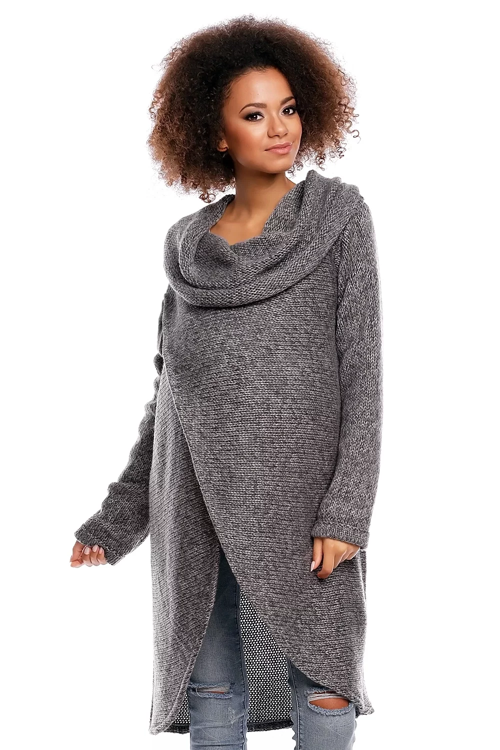Szczegóły: Kardigan, płaszczyk. Narzutka bez zapięcia, wkładana przez głowę. Mięciutka i puchata. Krój asymetryczny, zakładany przód. Włochaty sweterek z luźnym golfem. Nadaje się zarówno na ciążę, jak i później. Idealny krój do karmienia.