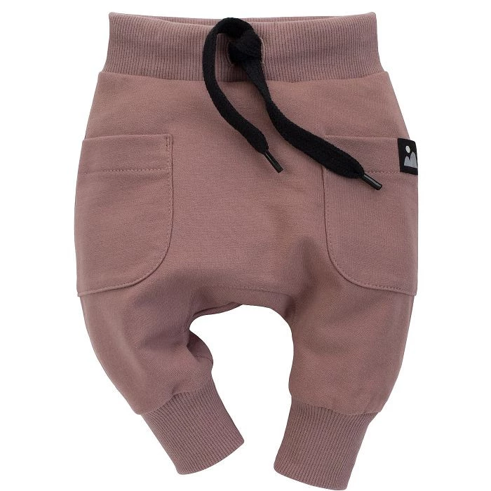 Spodnie mają luźny fason, który nie krępuje ruchów dziecka i zapewnia swobodę podczas zabawy, nauki raczkowania czy chodzenia. Po bokach umieszczono dwie praktyczne kieszenie na dziecięce skarby, a na lewej kieszonce – ozdobną naszywkę z motywem gór, dodającą im wyjątkowego charakteru.
