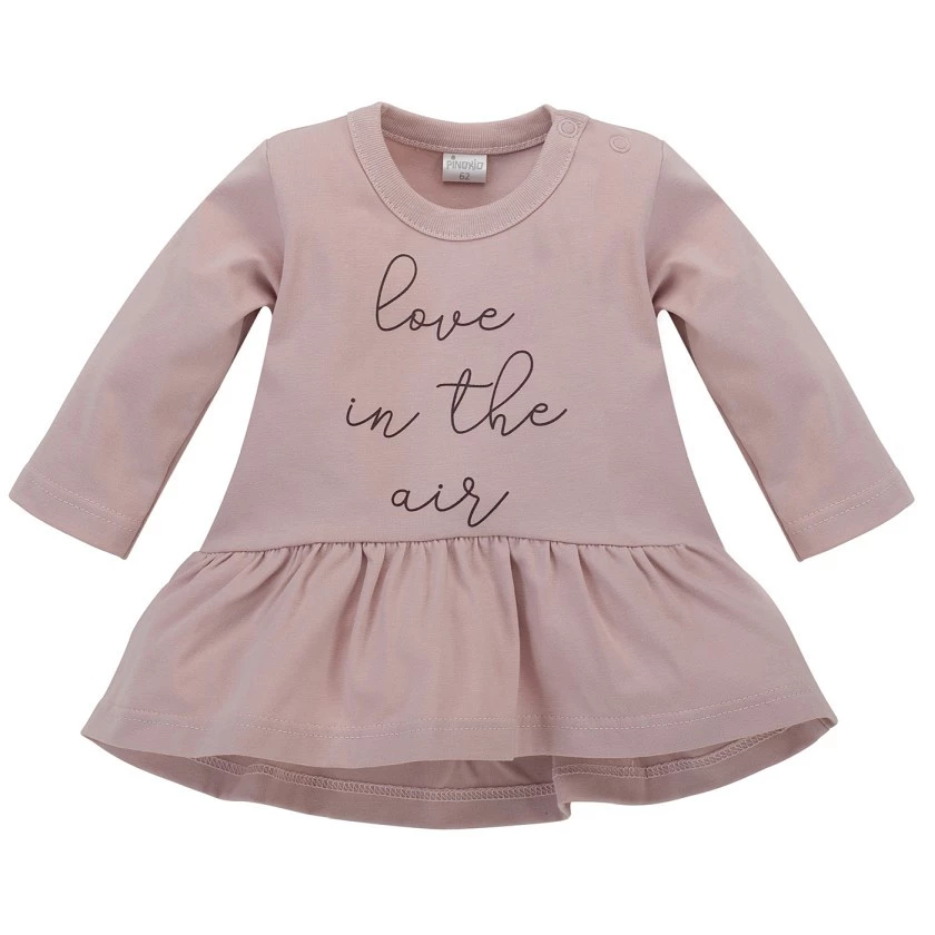 Na przodzie, na wysokości klatki piersiowej, znajduje się nadruk z napisem „LOVE IN THE AIR”, wykonany trwałą i bezpieczną metodą farb wodnych. Tył tuniki jest lekko wydłużony, a mocno marszczona falbanka dodaje jej dziewczęcego uroku.