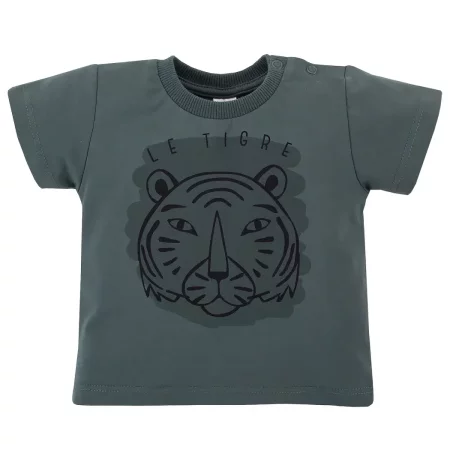 Na przodzie koszulki znajduje się efektowny nadruk głowy tygrysa oraz napis „Le Tigre” w języku francuskim, nadający ubranku modnego, miejskiego charakteru. Dekolt wykończono ozdobną lamówką, która podkreśla wyjątkowy design.