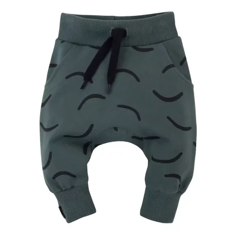Spodnie posiadają luźny fason i obniżony krok, dzięki czemu nie krępują ruchów podczas zabawy, nauki raczkowania czy pierwszych kroków. W pasie wszyto elastyczną gumkę oraz regulowane sznureczki, zabezpieczone przed wysuwaniem się – idealne rozwiązanie dla dzieci drobniejszej budowy. Nogawki zakończone są efektownymi ściągaczami, które utrzymują pumpy na miejscu i pozwalają lepiej dopasować je do wzrostu dziecka.