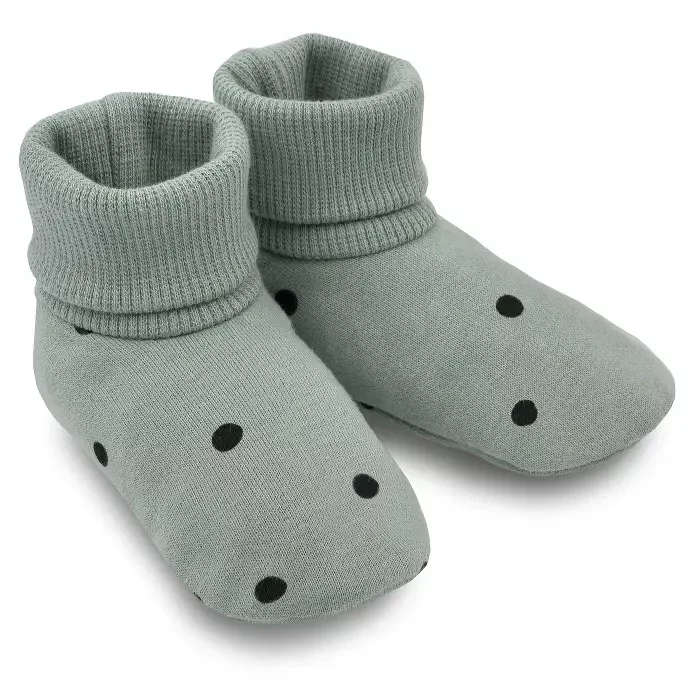 Miękkie buciki niemowlęce z kolekcji „Très Bien” w modnym, miętowym kolorze z subtelnym printem w kropeczki to idealny element wyprawki dla noworodka, łączący komfort, bezpieczeństwo oraz francuski styl od pierwszych dni życia.