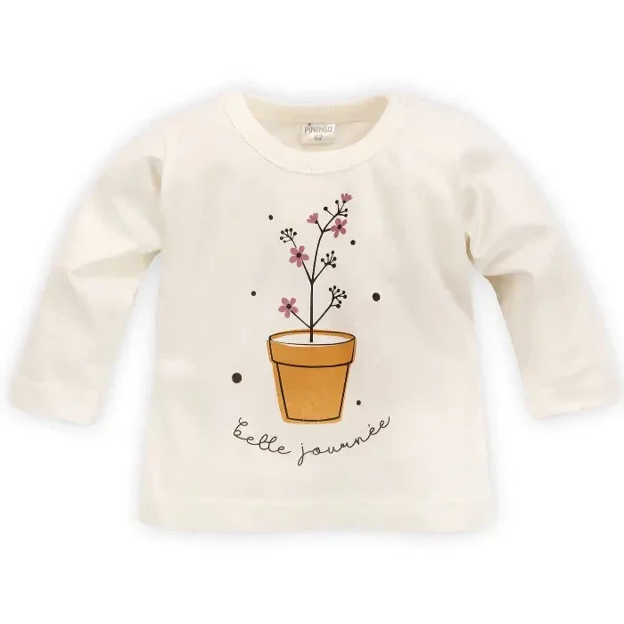 Bluzeczka została uszyta w 100% z wysokiej jakości, miękkiej bawełny w delikatnym odcieniu écru, który jest uniwersalny i pasuje do wielu stylizacji, zarówno codziennych, jak i odświętnych. Na przodzie znajduje się uroczy nadruk kwiatuszka w doniczce oraz napis „Belle Journée”, co nadaje bluzeczce wyjątkowego, francuskiego uroku. Dzięki praktycznym bezniklowym napkom na lewym ramieniu, ubieranie oraz zdejmowanie bluzeczki jest szybkie i komfortowe, co szczególnie docenią rodzice podczas codziennego użytkowania.