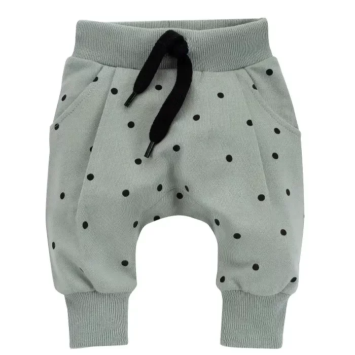 W pasie znajduje się szeroki ściągacz z gumką oraz sznureczki do regulacji obwodu, zabezpieczone przed wysuwaniem się. Dzięki temu spodnie można łatwo dopasować do sylwetki dziecka – nawet jeśli jest drobniejszej budowy. Luźny fason i obniżony krok zapewniają swobodę ruchu, komfort noszenia oraz odpowiednią ilość miejsca na pieluszkę.