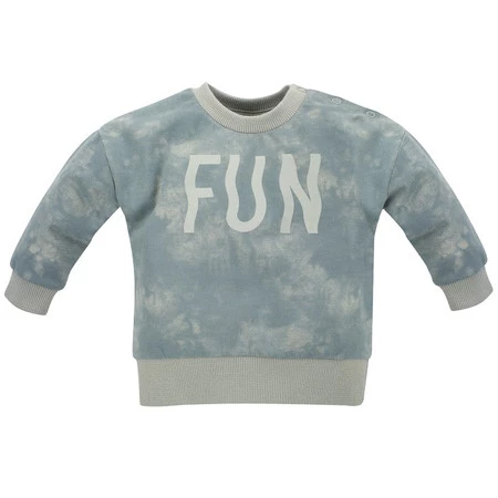 Na przodzie bluzy umieszczono ozdobny nadruk „FUN”, wykonany bezpieczną metodą farb wodnych, nawiązujący do motywu przewodniego kolekcji – radosnej, beztroskiej zabawy. Ściągacze przy rękawach i dole bluzy dbają o dopasowanie i dodatkowo chronią dziecko przed chłodem i wiatrem.