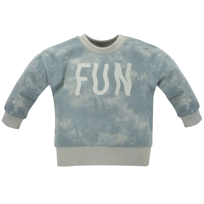 Modna i wygodna bluza z długim rękawem, zakładana przez głowę, z kolekcji Fun Time została uszyta z miękkiej, 100% bawełny w efektownym princie tie-dye w odcieniach zieleni i niebieskiego. To wyjątkowy model, który łączy komfort noszenia z aktualnymi trendami mody dziecięcej.