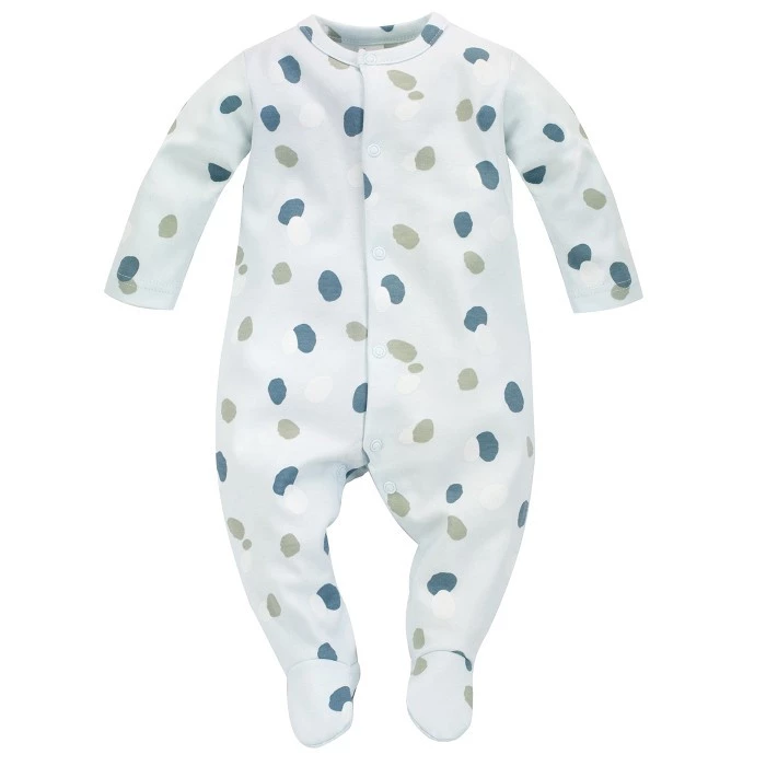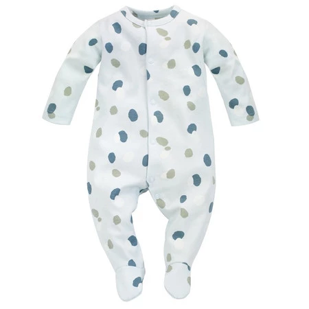 Model w jasnym, miętowym kolorze ozdobiony jest subtelnym printem niebieskich i zielonych plamek, które idealnie wpisują się w stylistykę kolekcji. Dzięki wszytemu w kroku klinowi, pajacyk dopasowuje się do sylwetki dziecka i zapewnia odpowiednią ilość miejsca na pieluszkę. Gumki nad piętkami zapobiegają zsuwaniu się nóżek z nogawek.