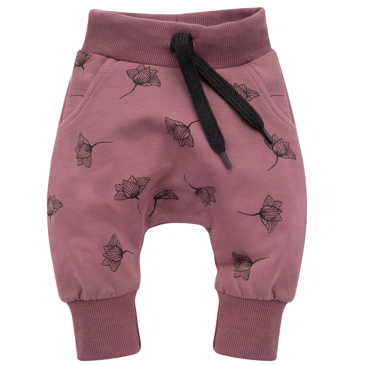 Spodnie mają dwie praktyczne kieszenie, idealne na dziecięce skarby. W pasie zastosowano szeroki, elastyczny ściągacz z wszytą gumką, a dodatkowa regulacja na sznureczki pozwala idealnie dopasować ubranko do sylwetki. Nogawki zakończone są praktycznymi ściągaczami, które utrzymują spodnie w odpowiednim miejscu.