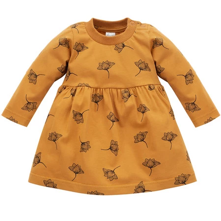 Materiał w modnym kolorze złota Inków ozdobiony został subtelnym, kwiatowym printem, wykonanym metodą bezpiecznych farb wodnych, odpornych na codzienne pranie i użytkowanie. Sukienka została odcięta na wysokości klatki piersiowej i mocno zmarszczona, dzięki czemu delikatnie się rozkloszowuje i wygląda niezwykle dziewczęco.