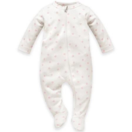 Model w kolorze ecru ozdobiony jest uroczym nadrukiem różowych kwiatuszków, co nadaje mu dziewczęcego i subtelnego charakteru. Zapinanie na suwak na całej długości pozwala szybko i wygodnie ubrać lub przebrać maluszka, a specjalne zabezpieczenia – łezka przy szyi oraz plisa od wewnętrznej strony – chronią delikatną skórę dziecka przed otarciami.
