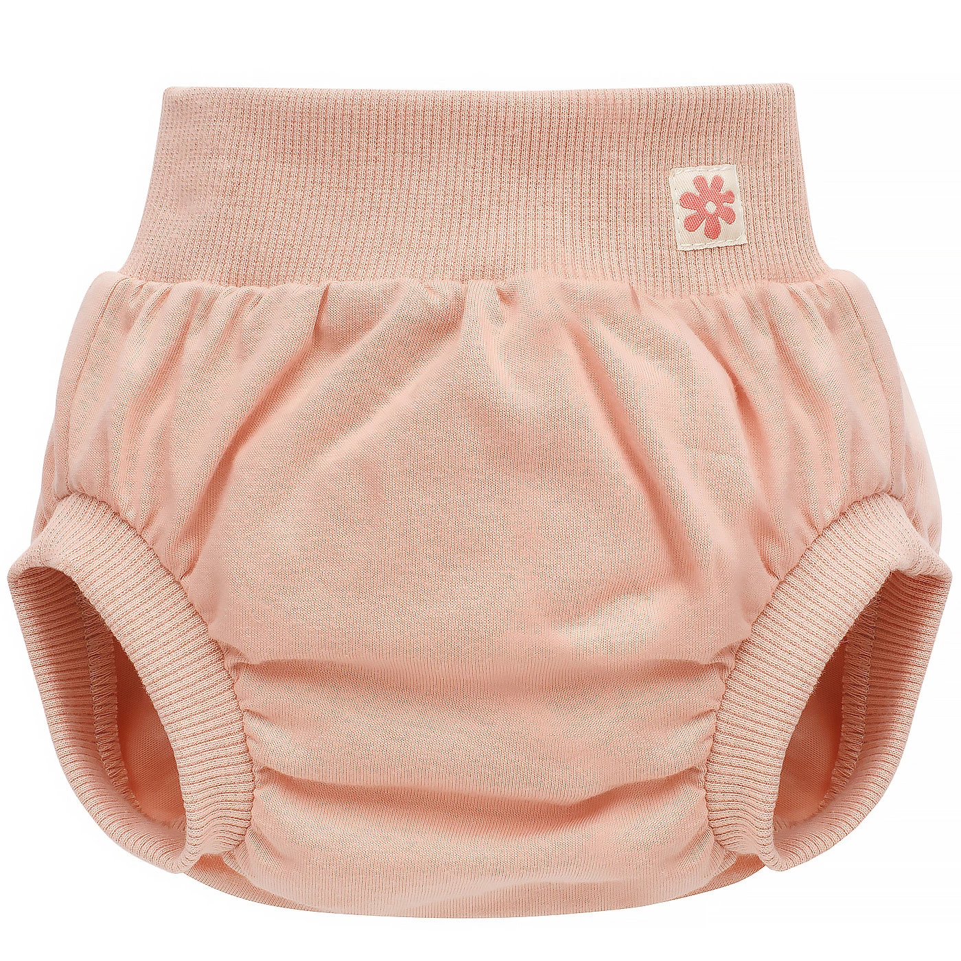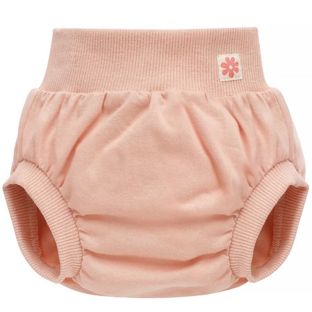 Model w uroczym, różowym kolorze ozdobiono naszywką z kwiatuszkiem na lewym bioderku, co dodaje mu dziewczęcego charakteru. Nieuciskający ściągacz w pasie i nogawkach utrzymuje bloomersy we właściwym miejscu, nie powodując podrażnień na wrażliwej skórze dziecka. To praktyczne i modne rozwiązanie, które w estetyczny sposób zakrywa pieluszkę podczas letnich spacerów, rodzinnych wakacji czy codziennych aktywności.