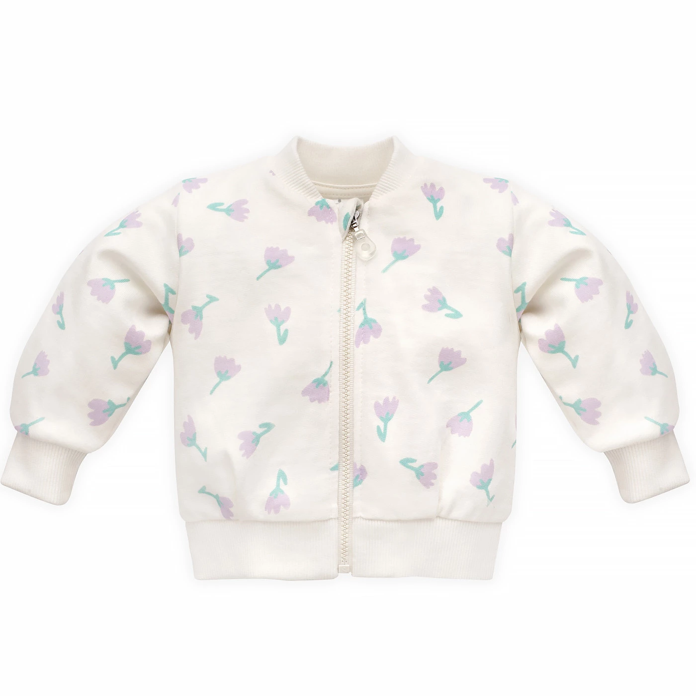 Bluza jest rozpinana na całej długości za pomocą wygodnego suwaka, co ułatwia zakładanie i zdejmowanie. Anatomiczny krój zapewnia swobodę ruchów podczas zabawy, nauki chodzenia czy codziennych aktywności. Ozdobne ściągacze przy rękawach, szyjce i dole bluzy dbają o to, by ubranko dobrze leżało i pozostawało na miejscu.