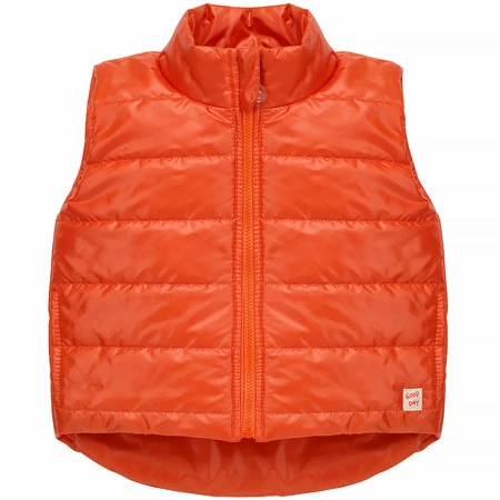 Bezrękawnik z kolekcji Orange Flip to połączenie funkcjonalności, wygody i nowoczesnego designu. Wykonany z jaskrawego pomarańczowego materiału o delikatnym połysku, przyciąga wzrok i dodaje energii dziecięcym stylizacjom. Ciekawe pikowania nadają mu modnego charakteru, a lekko obniżony tył skutecznie chroni plecki dziecka przed wiatrem.