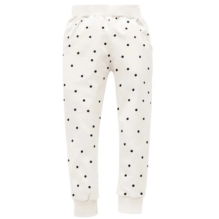 Spodnie z kolekcji Tres Bien to doskonały wybór. Uszyte z miękkiej, 100% bawełnianej dzianiny w kolorze ecru, ozdobione delikatnym nadrukiem czarnych kropeczek w stylu francuskim, wprowadzą odrobinę paryskiego szyku do dziecięcej garderoby.