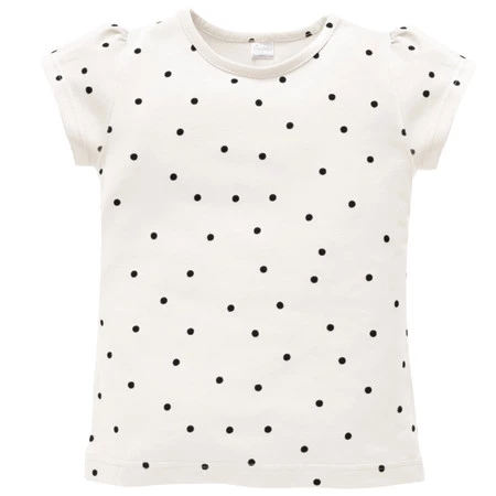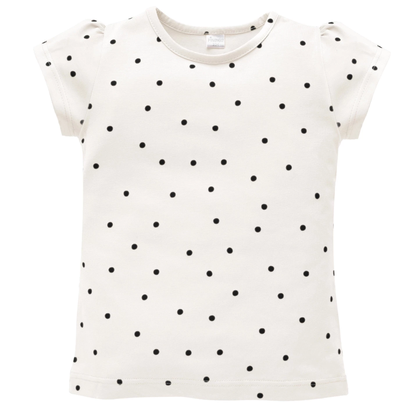 Koszulka utrzymana jest w eleganckim kolorze ecru, ozdobionym modnym printem w groszki, wykonanym bezpiecznymi, wodnymi farbami odpornymi na pranie, co zapewnia trwałość i zachowanie intensywności wzoru nawet po wielu praniach. Anatomiczny krój T-shirtu zapewnia dziecku swobodę ruchów, co jest niezwykle ważne podczas codziennych aktywności i zabawy. Dla wygody rodziców, w rozmiarach do 86 cm zastosowano praktyczne zatrzaski przy dekolcie, które ułatwiają szybkie i komfortowe ubieranie oraz zdejmowanie koszulki, bez podrażniania delikatnej skóry dziecka. W większych rozmiarach koszulka zakładana jest wygodnie przez głowę.