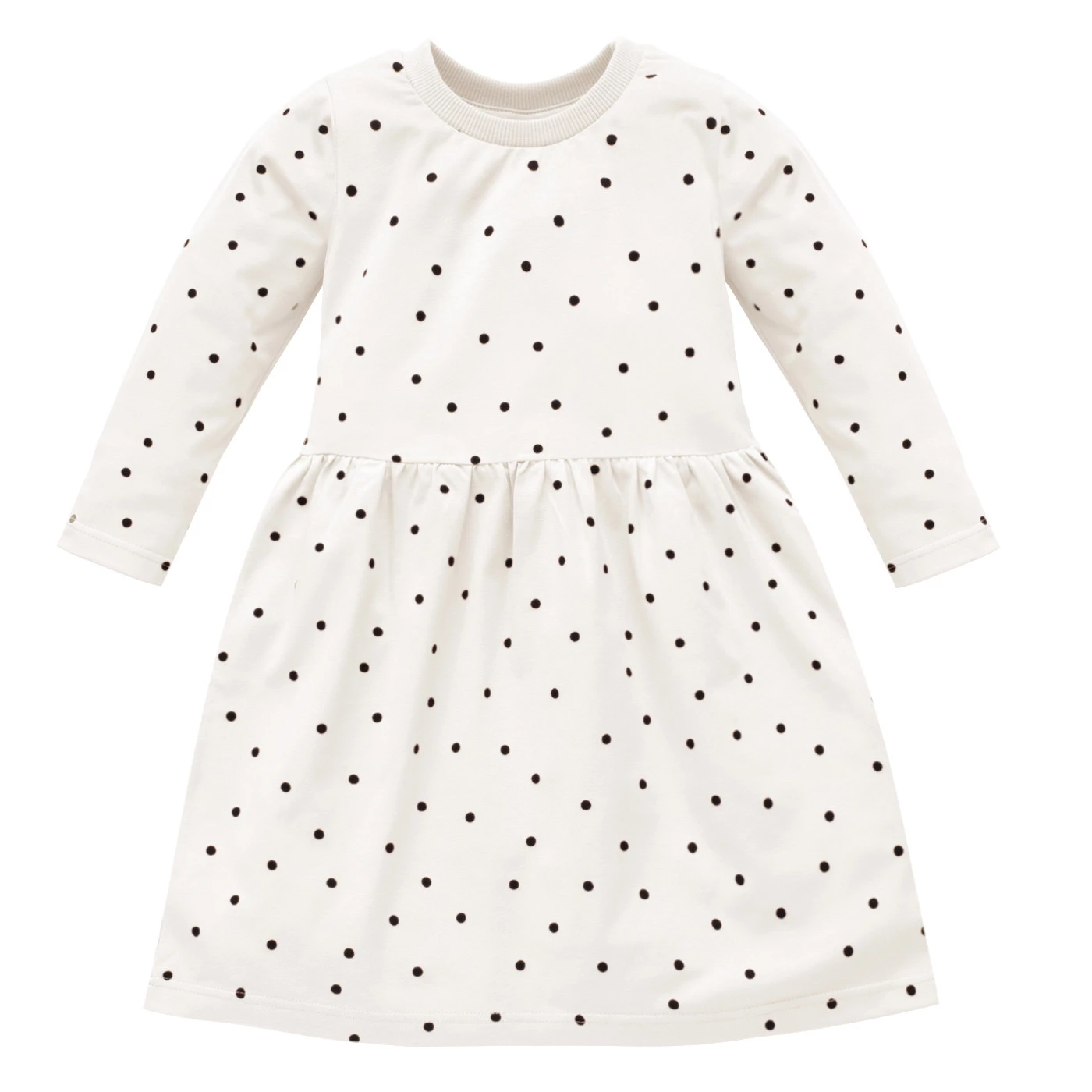Ta sukienka dla dziewczynki z długim rękawem to połączenie francuskiej elegancji i dziecięcej wygody. Uszyta została z delikatnej bawełnianej dzianiny w kolorze écru, ozdobionej drobnym nadrukiem czarnych kropeczek. Subtelny design sprawia, że ubranko prezentuje się niezwykle dziewczęco i pasuje zarówno na co dzień, jak i na specjalne okazje.