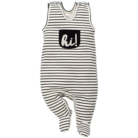 Mięciutkie i wygodne śpiochy niemowlęce w paski z kolekcji Happy Day to must-have w garderobie maluszka. Uszyte w 100% z naturalnej bawełny, zapewniają dziecku komfort, delikatność i przewiewność. Uroczy wzór w drobne czarno-białe paseczki nadaje im modnego charakteru, a czarna kieszonka z wypukłym nadrukiem dodaje oryginalności.