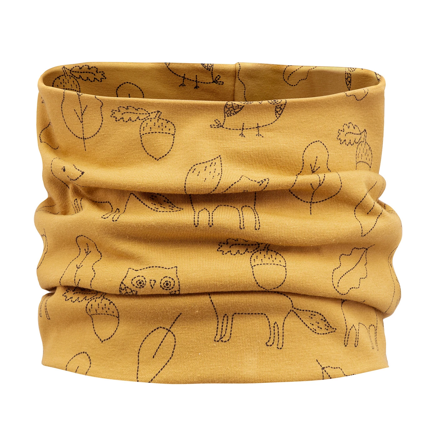 Stylowy i praktyczny komin dziecięcy z kolekcji Secret Forest to doskonały wybór na sezon przejściowy. Wykonany z cienkiej, elastycznej dzianiny bawełnianej w ciepłym musztardowym odcieniu, zdobiony leśnymi motywami – idealnie wpisuje się w jesienno-wiosenną garderobę każdego malucha.