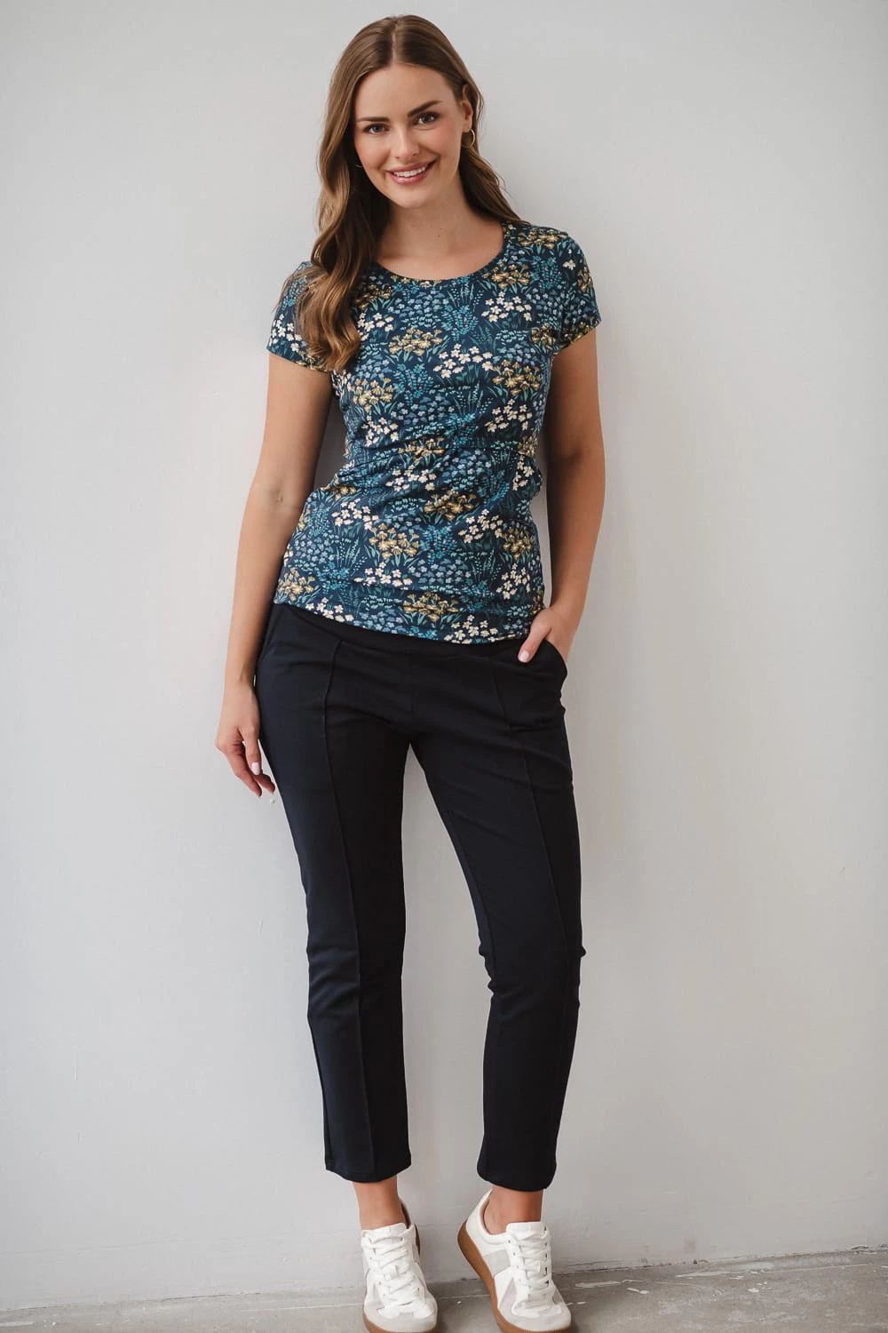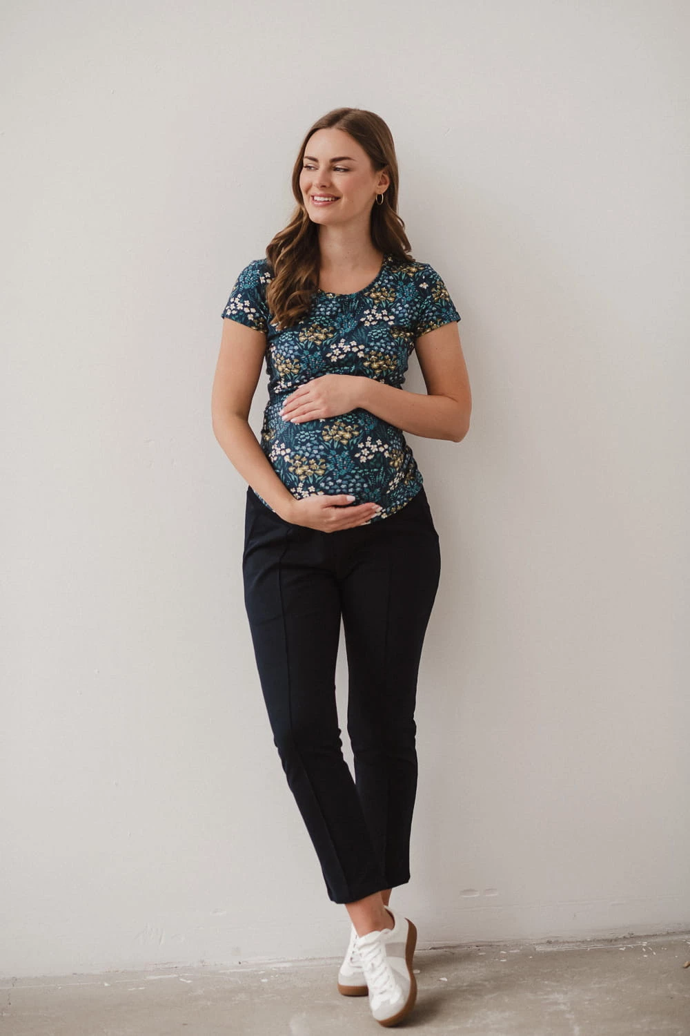Elastyczna, miękka dzianina z domieszką elastanu zapewnia wygodne dopasowanie do ciążowego brzuszka