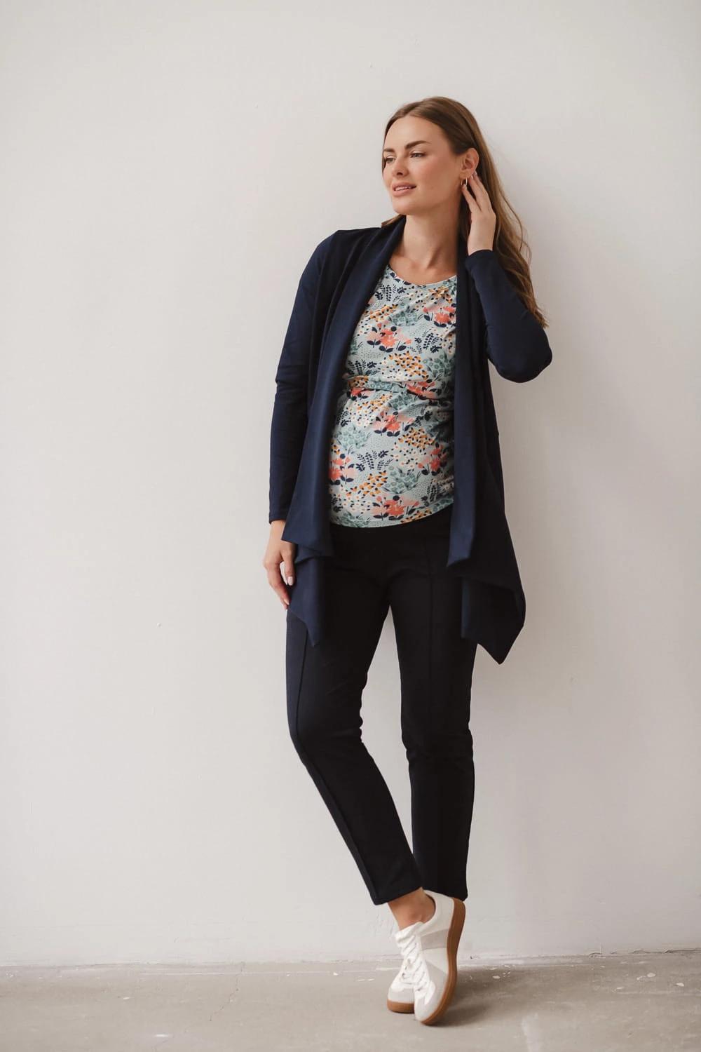 Wybierz rozmiar, który nosisz na co dzień. Kardigan wykonany jest z elastycznej dzianiny, dzięki czemu dopasowuje się do rosnącego brzuszka i zmieniającej się sylwetki po porodzie.