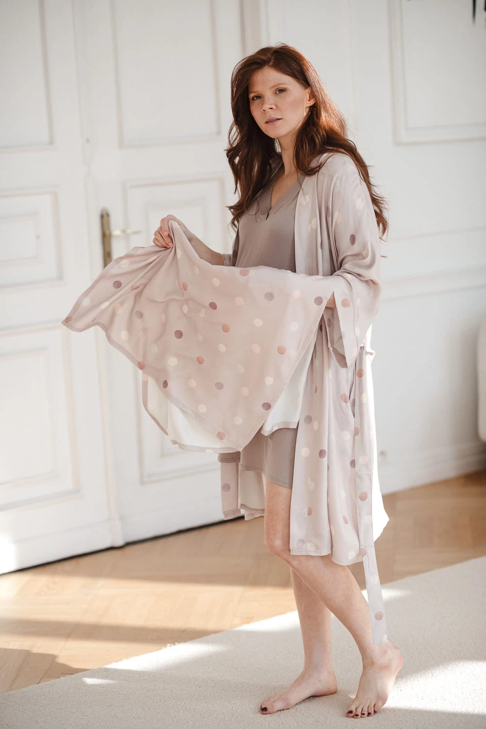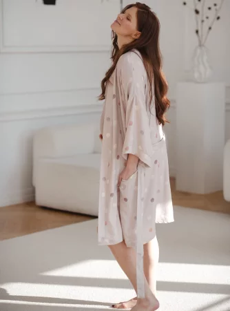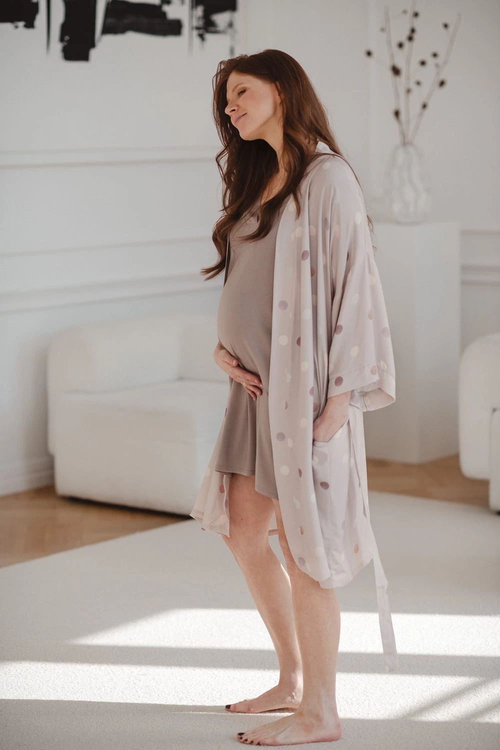 Szlafrok został zaprojektowany z funkcjonalnością na pierwszym miejscu. Rękawy o długości 7/8 nie krępują ruchów podczas codziennej opieki nad noworodkiem, a dodatkowe kieszenie są idealne na podręczne drobiazgi. Pasek pozwala na regulację szerokości, a nieco dłuższy krój sprawia, że szlafrok doskonale sprawdzi się w szpitalu lub podczas połogu.
