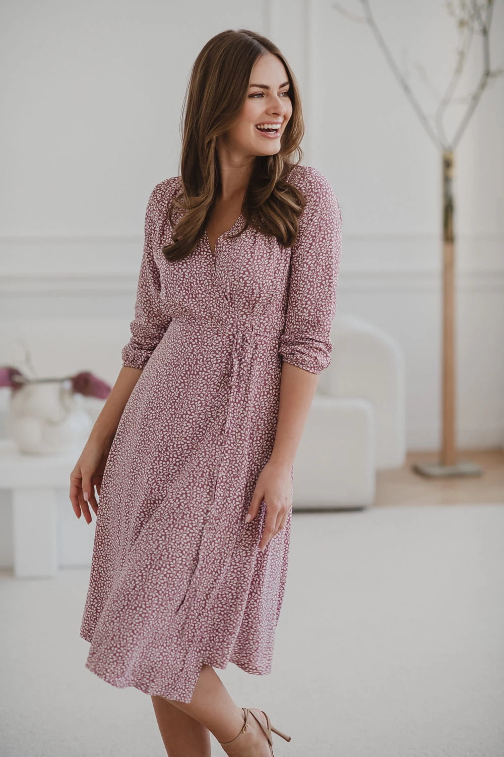 Dzięki wszytemu paskowi bez problemu dopasujesz sukienkę zarówno w trakcie ciąży, jak i po porodzie. Model pięknie otula ciążowy brzuszek, a po narodzinach dziecka świetnie sprawdzi się jako kobieca i praktyczna sukienka do karmienia. Jej midi długość i klasyczna forma sprawiają, że sukienka pasuje zarówno na co dzień, jak i na specjalne okazje — chrzciny, baby shower, rodzinne przyjęcia czy romantyczne spacery. Bez problemu wystylizujesz ją również w wersji casualowej, łącząc np. z trampkami lub balerinami.