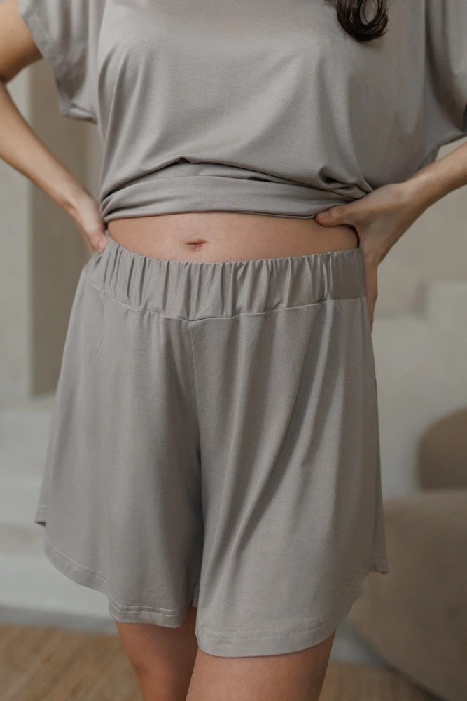 Poznaj szorty ciążowe Misty Mocha – zaprojektowane z myślą o maksymalnym komforcie w ciąży, podczas połogu i w codziennym relaksie. Wykonane z wyjątkowo miękkiej i przewiewnej wiskozy z dodatkiem elastanu, są tak lekkie, że prawie ich nie czuć na ciele. To idealne spodenki ciążowe na lato, do domu i na wyjście.