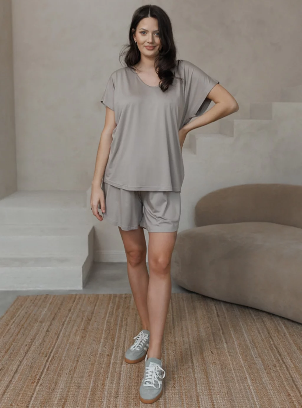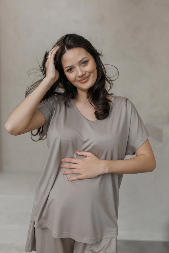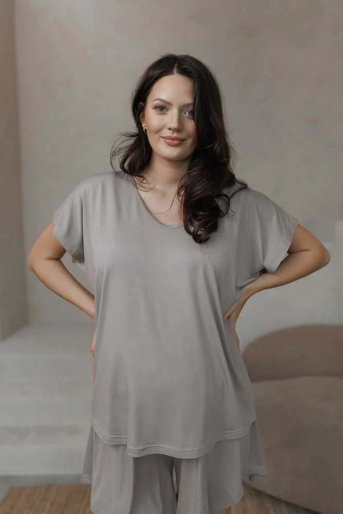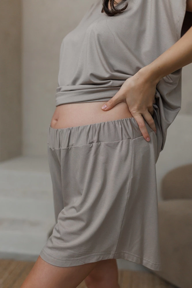 Te spodenki dla ciężarnych doskonale komponują się z koszulką Misty Mocha z krótkim rękawem – razem tworzą modny i praktyczny zestaw homewear dla przyszłych mam. To komplet, który łączy wygodę piżamy z wyglądem gotowym na miasto.