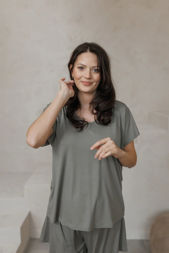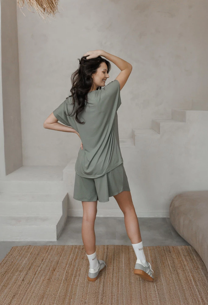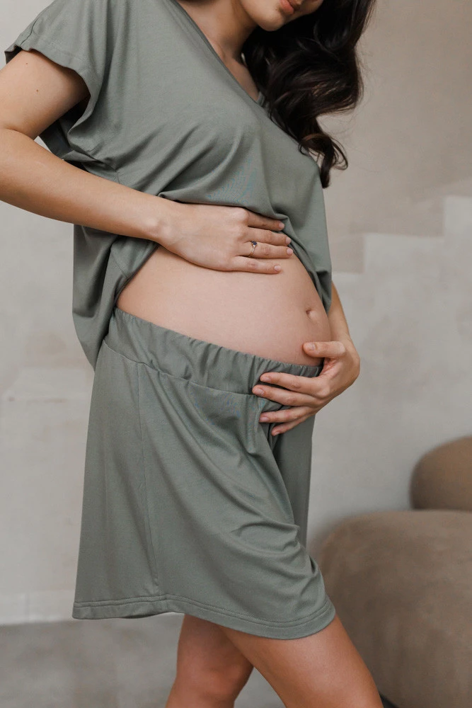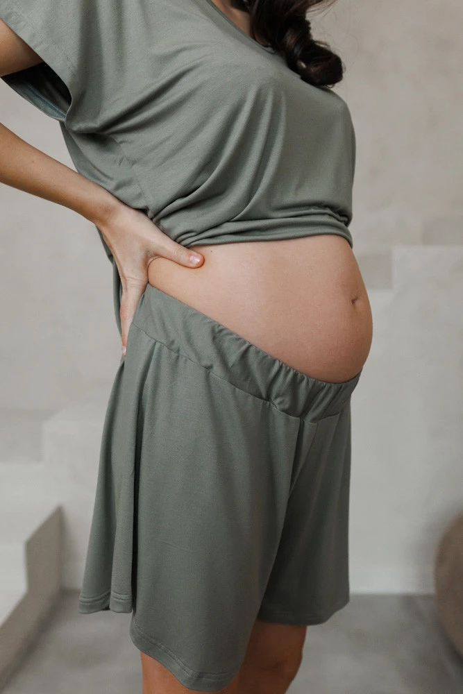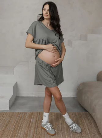 Te spodenki dla ciężarnych doskonale komponują się z koszulką Misty Mocha z krótkim rękawem – razem tworzą modny i praktyczny zestaw homewear dla przyszłych mam. To komplet, który łączy wygodę piżamy z wyglądem gotowym na miasto.