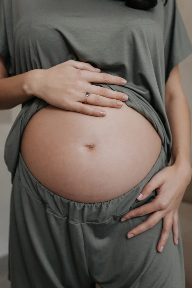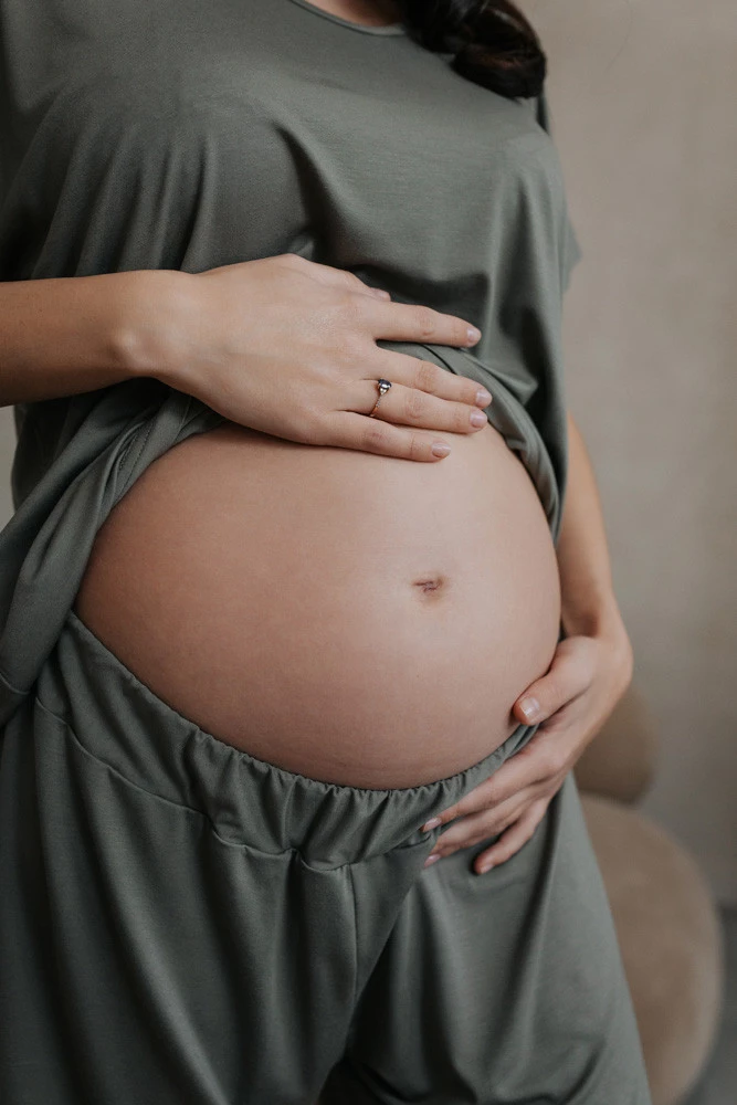 Pas pod brzuszkiem – specjalnie obniżony, z elastyczną, cienką gumką wszytą wewnątrz. Zero ucisku, maksimum komfortu dla wrażliwego brzucha w ciąży i po porodzie.