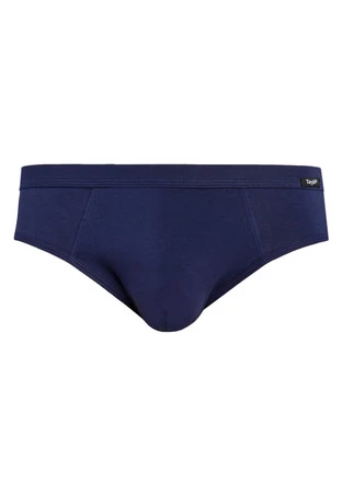 - - Męskie slipy w kolorze granatowym.- Posiadają prosty, klasyczny fason bez zdobień.- Wokół ud slipy są wyżej wycięte.- W pasie znajduje się delikatne logo firmy.