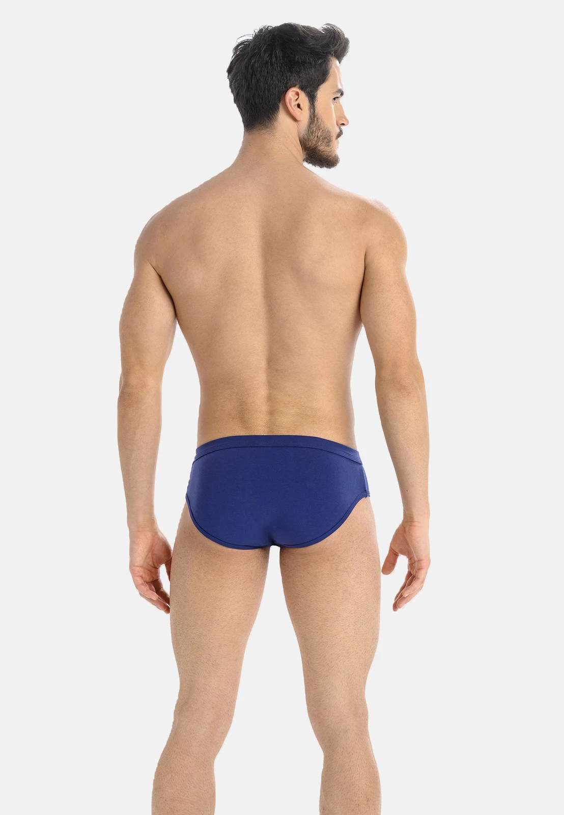 Zestaw męskich slipów w odcieniu jeansowym. Trzy pary slipów uszytych z przewiewnej, przyjaznej dla skóry bawełny z dodatkiem elastycznych włókien, dzięki czemu bielizna doskonale dopasowuje się do męskiej sylwetki i zapewnia komfort noszenia przez cały dzień.