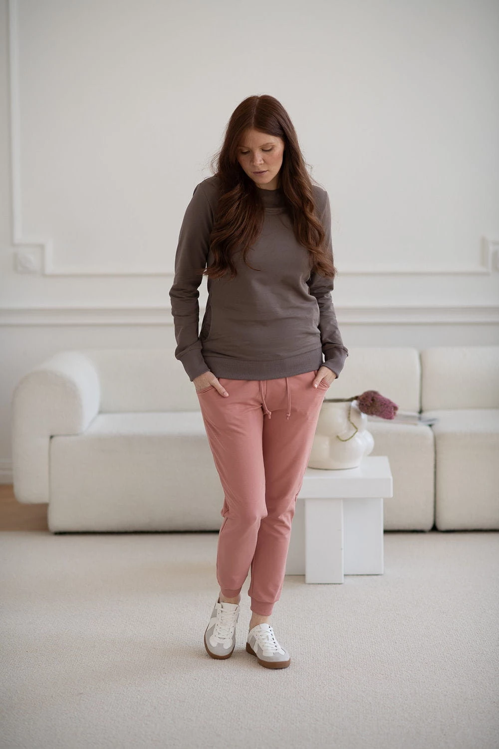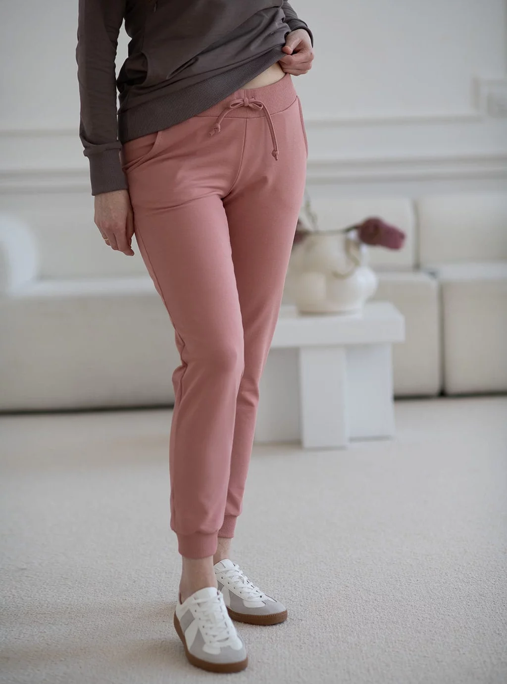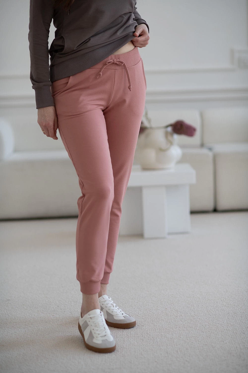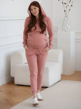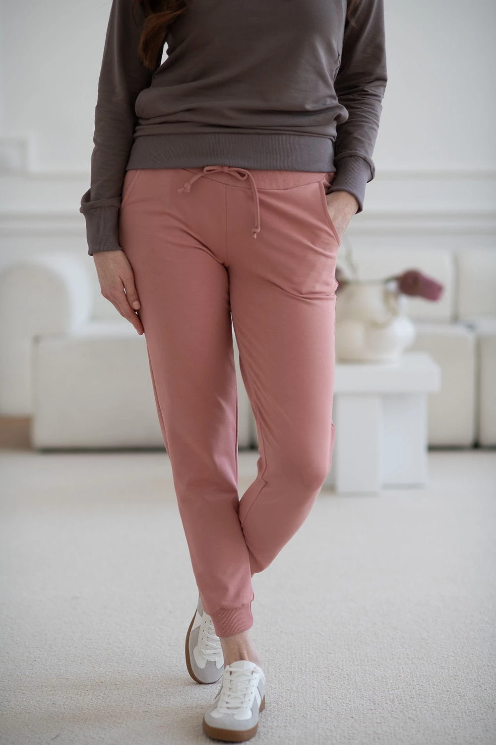 Spodnie dresowe w odcieniu herbacianej róży to propozycja dla Pań które lubią ładne i praktyczne rozwiązania. Krój spodni który może Ci towarzyszyć również po porodzie, ponieważ pas z miękką gumką i regulacją w postaci sznurka w tych wygodnych spodniach nie uciska brzucha, wtedy kiedy dochodzisz do Siebie po ciąży.